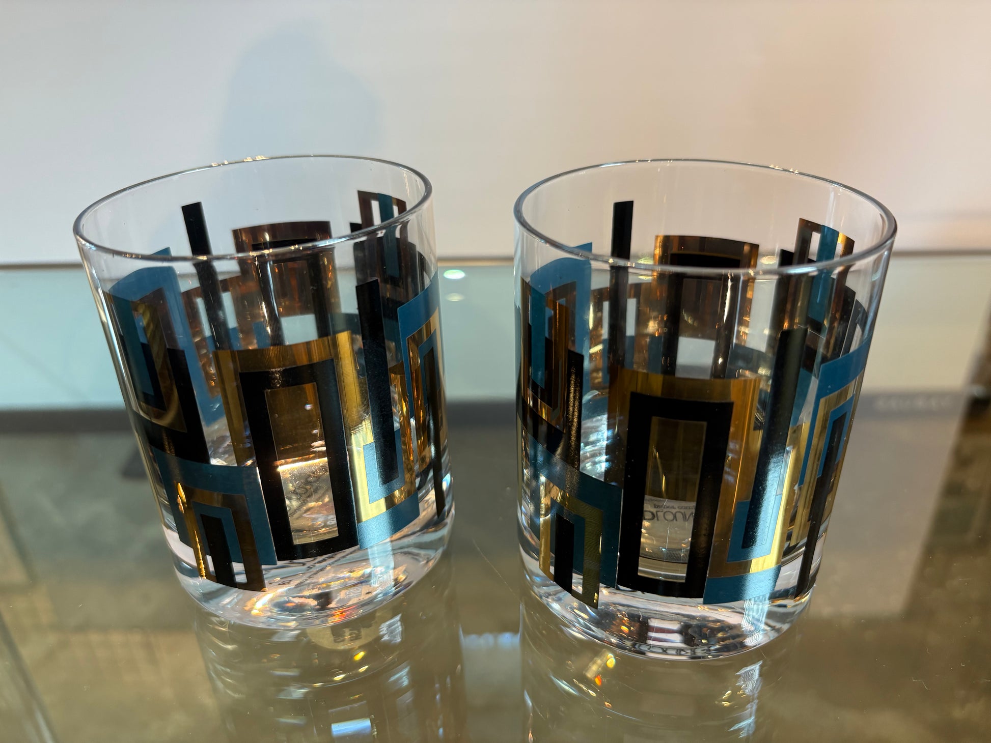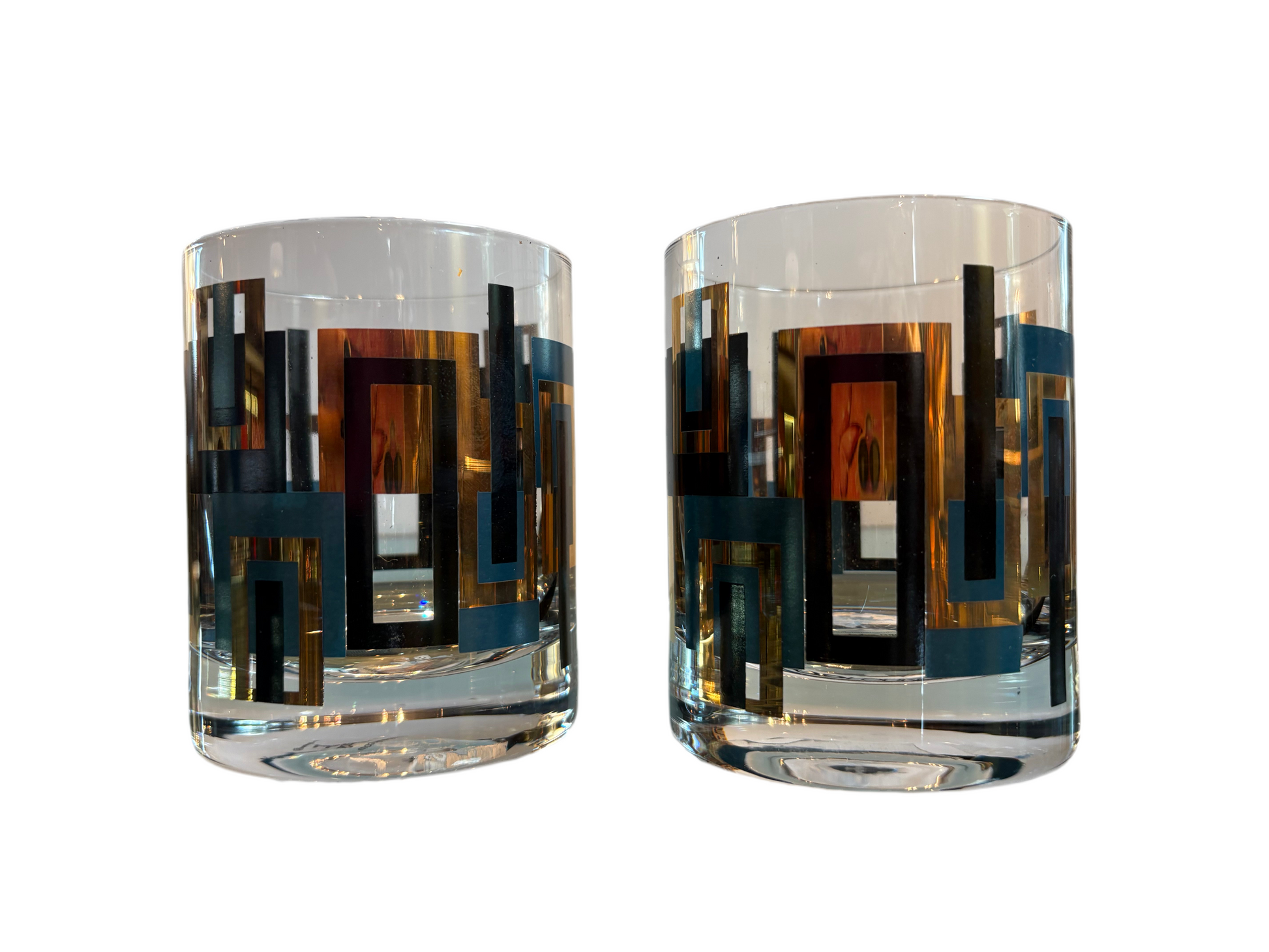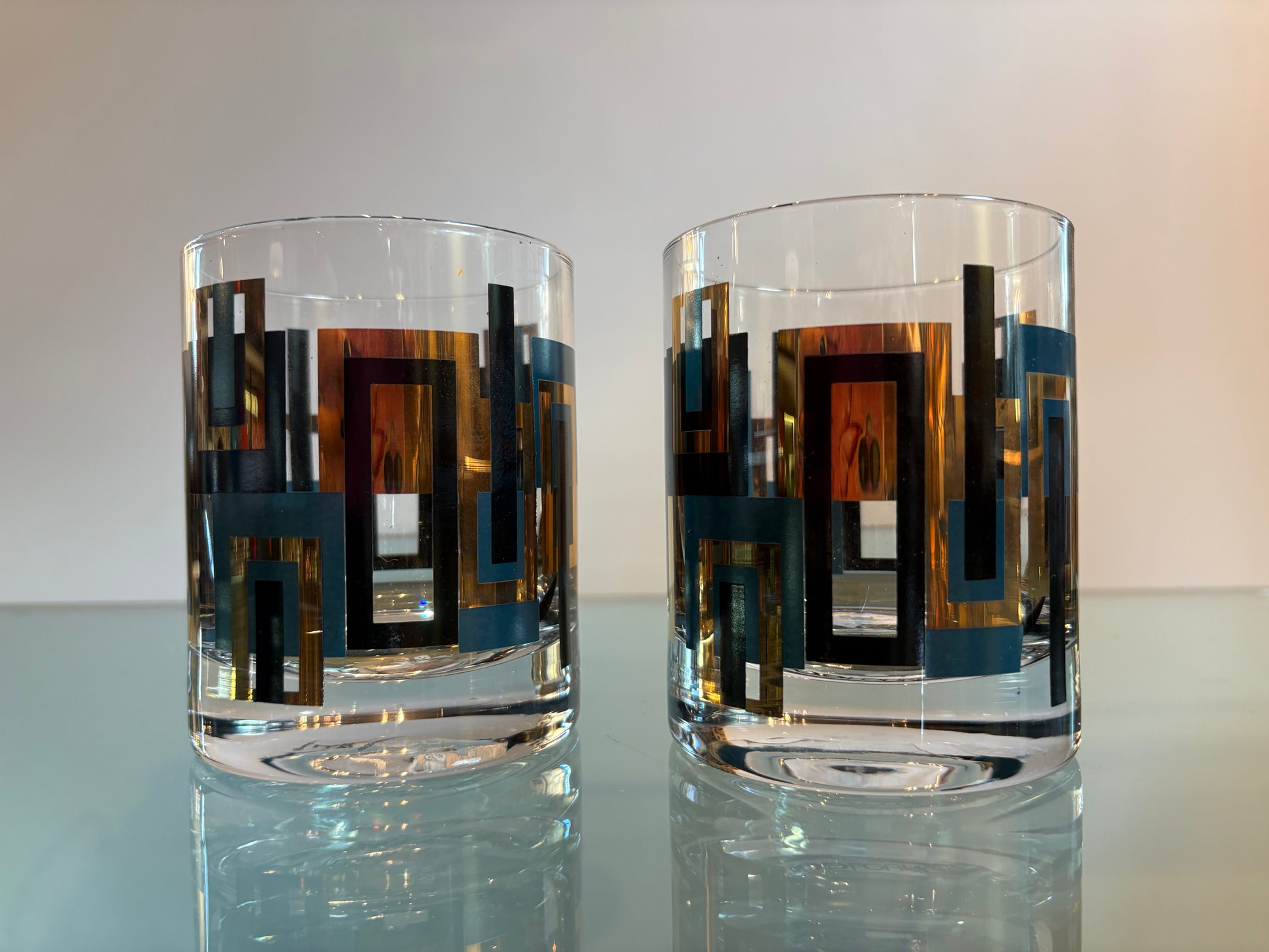 SET OF TWO BLUE AND GOLD MID CENTURY MODERN STYLE WHISKEY GLASSES BY MODLOUNGE