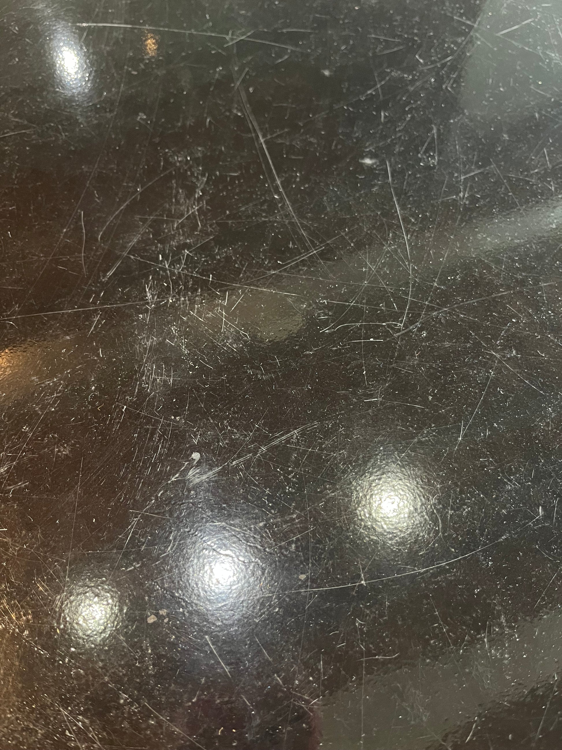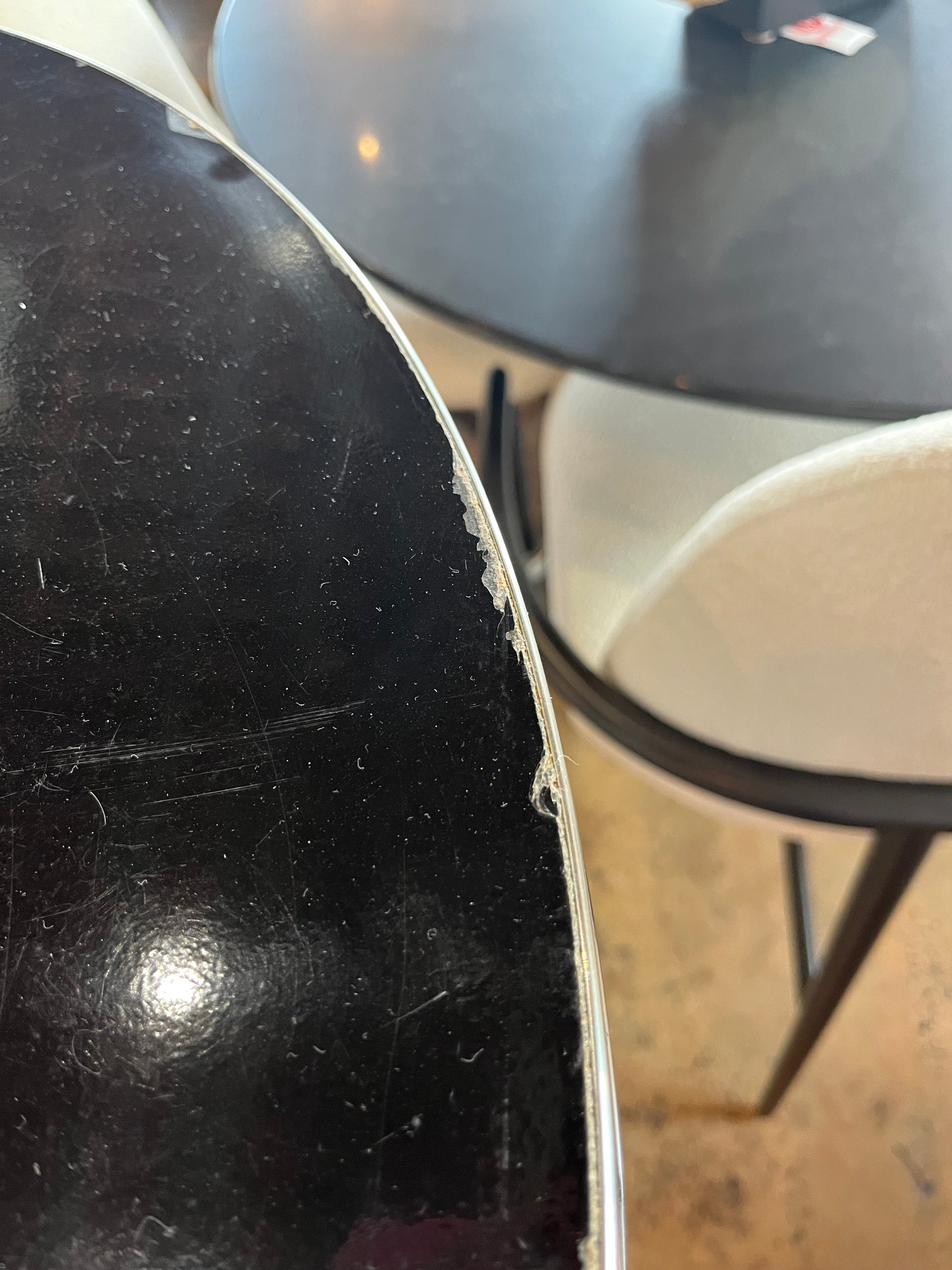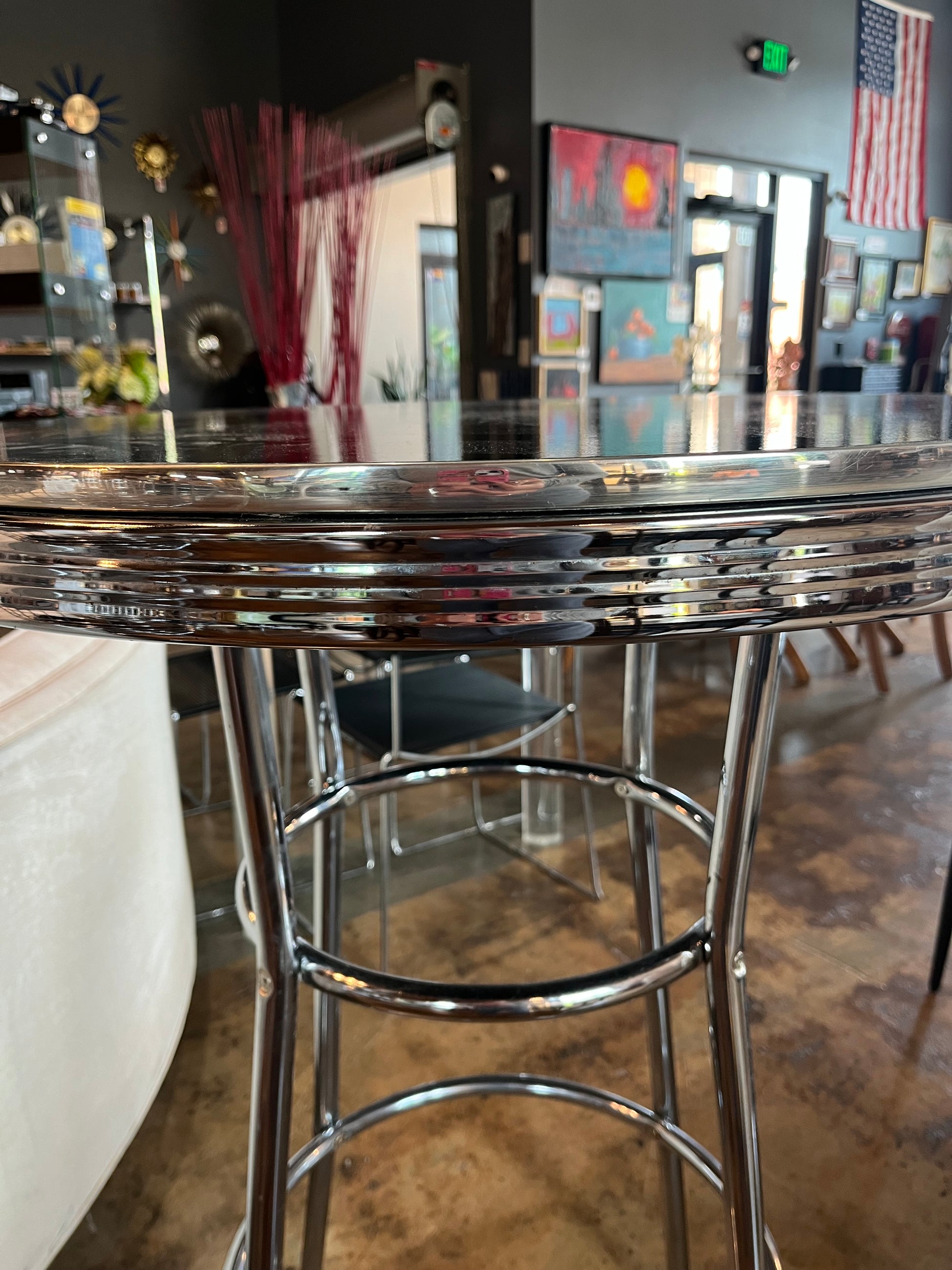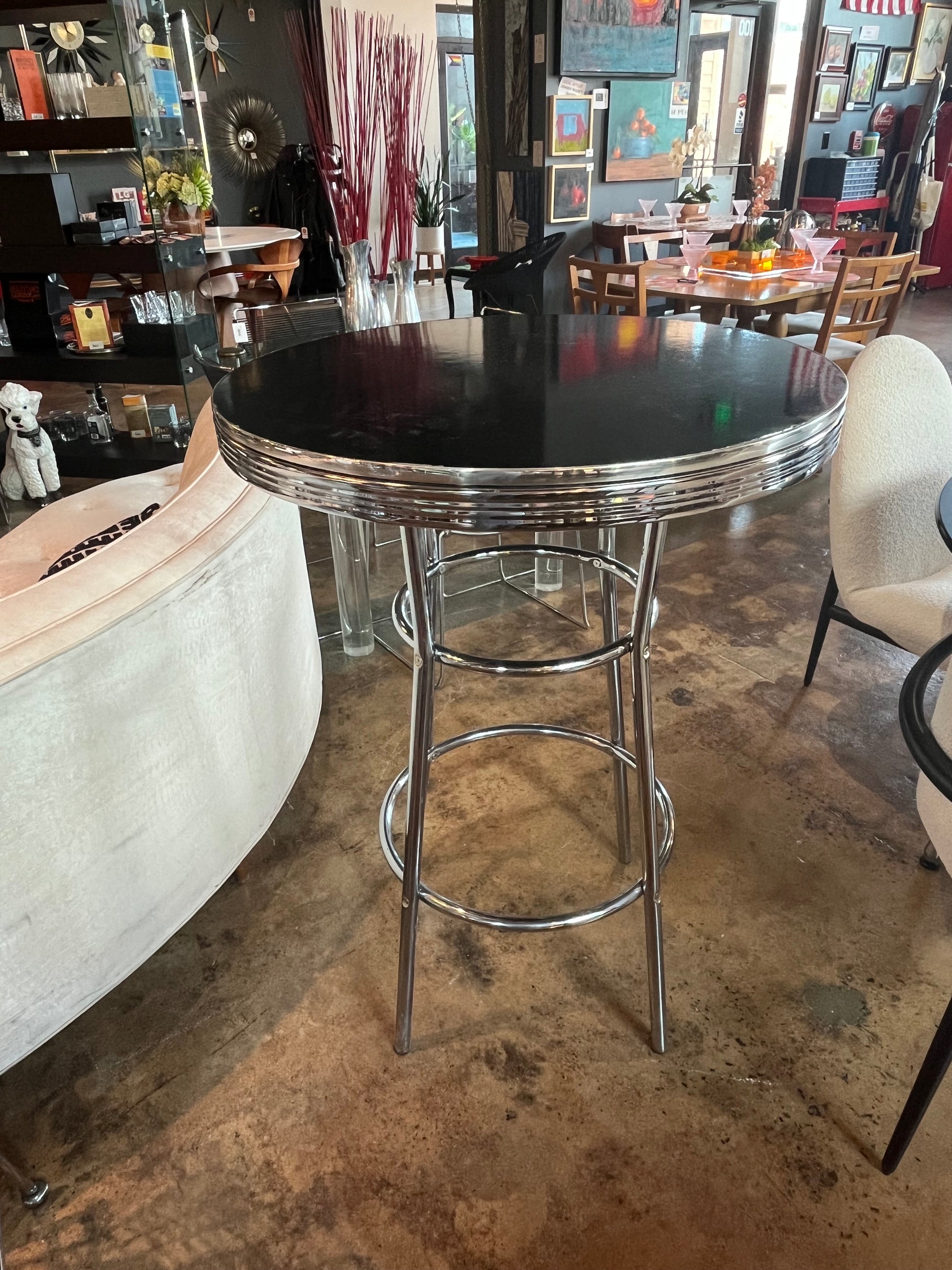 CHROME/ BLACK PUB TABLE WITH A GLOSSY LAMINATE TABLETOP. THIS RETRO TABLE SHOWS THE PATINA OF TIME WITH SIGNS OF WEAR AND TEAR WITH SCRATCHES ON THE LAMINATE AS WELL AS SOME ACCUMULATION OF RUST, AS SHOWN IN THE PHOTOGRAPHS.