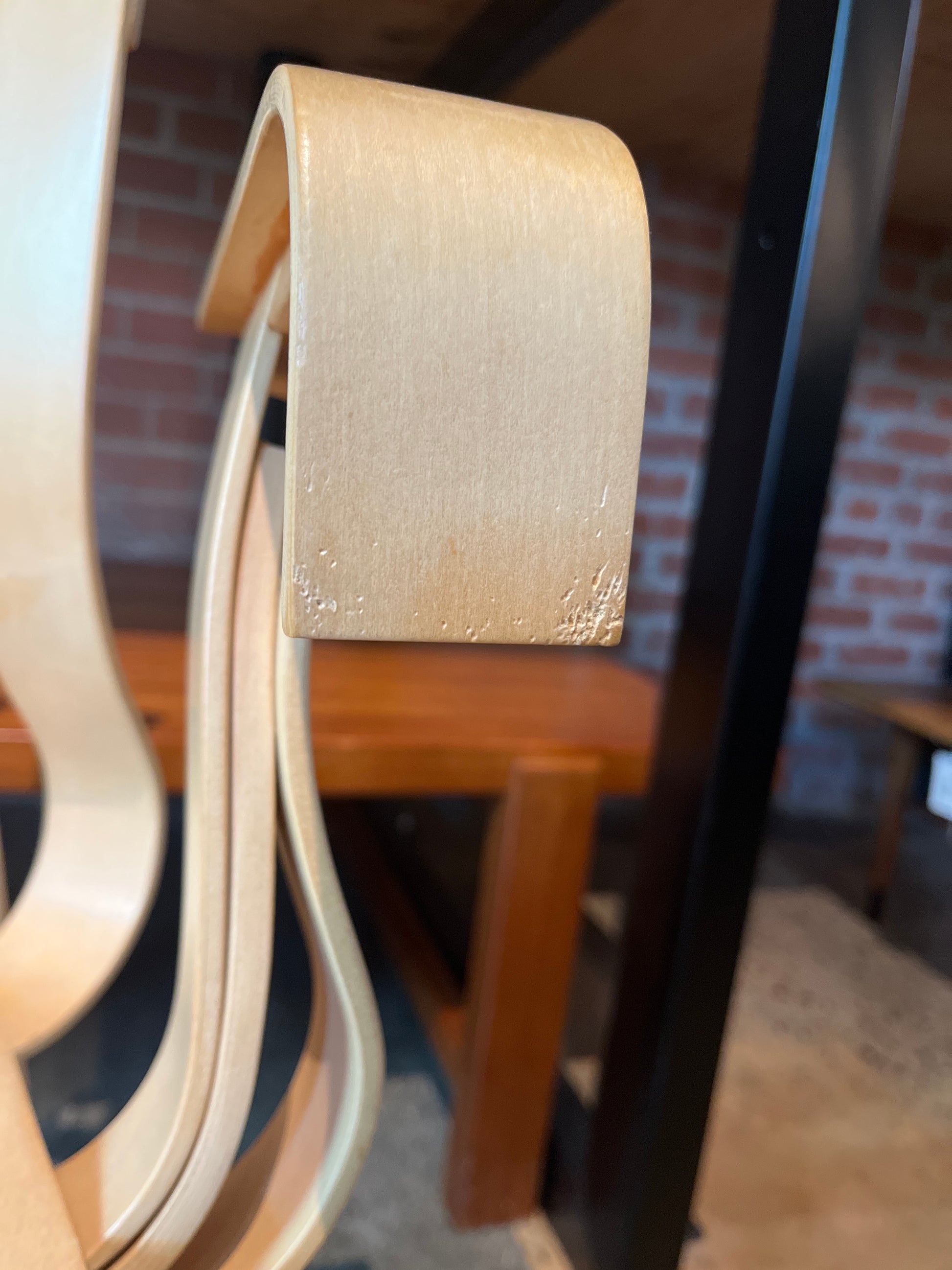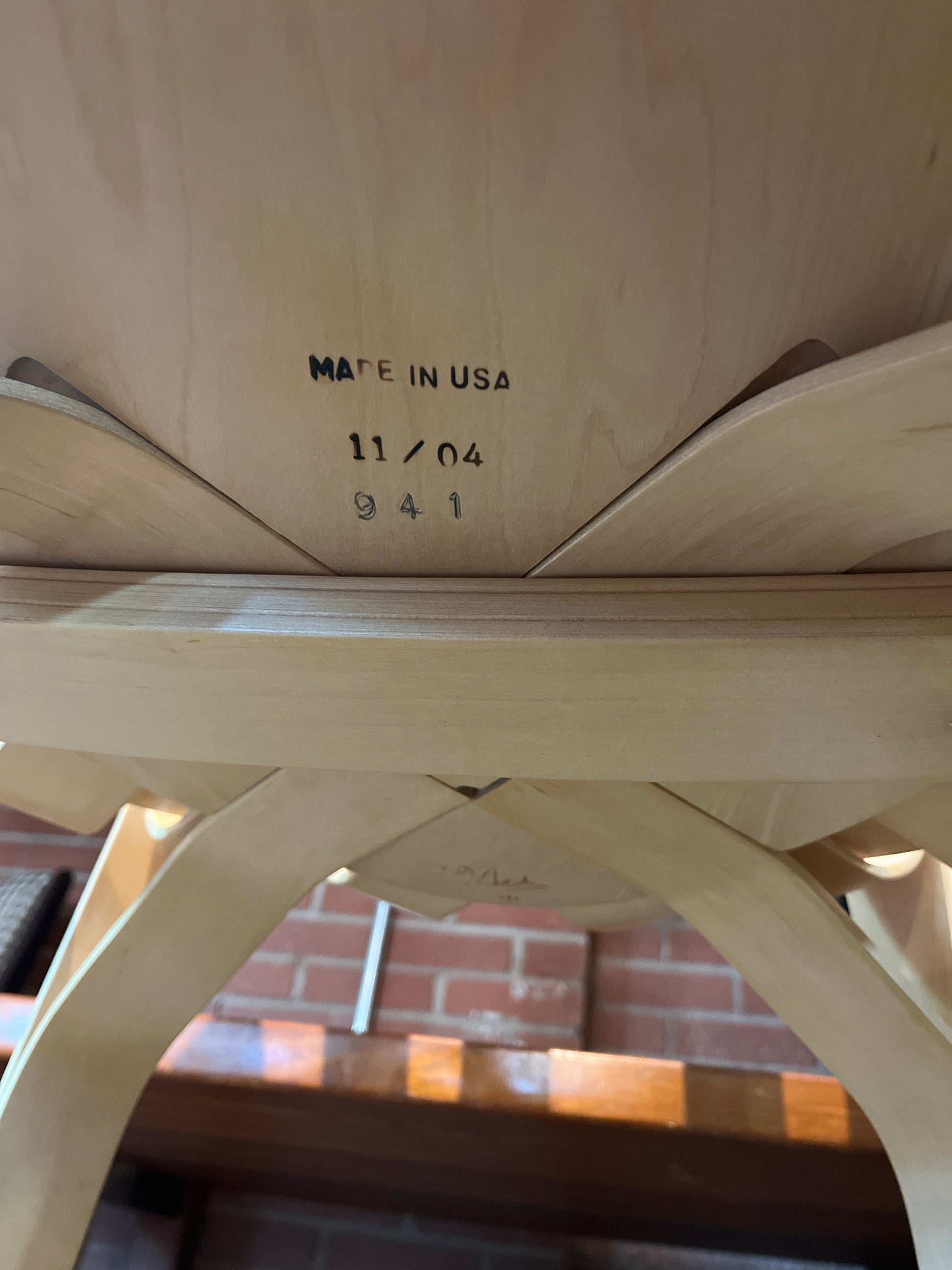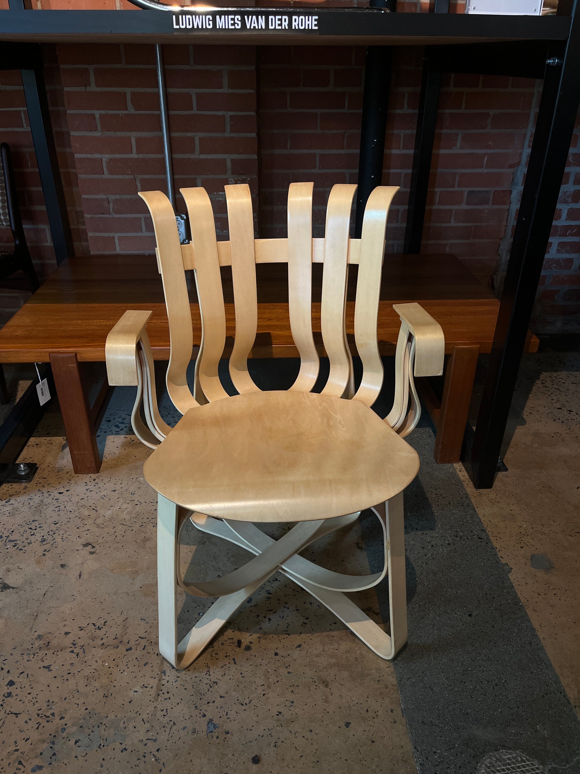 SET OF 4 MODERN HAT TRICK CHAIRS IN MAPLE WOOD. ARCHITECT FRANK GEHRY DESIGNED THESE CHAIRS FOR KNOLL IN 1992. THE ELEGANT CURVED WOOD STRIPS GIVE THESE CHAIRS A VERY ORGANIC FEEL, WITH MINIMAL IMPERFECTIONS IN THE WOOD, MAKING THEM THE PERFECT COMBINATION OF FUNCTION AND ARTISTRY.