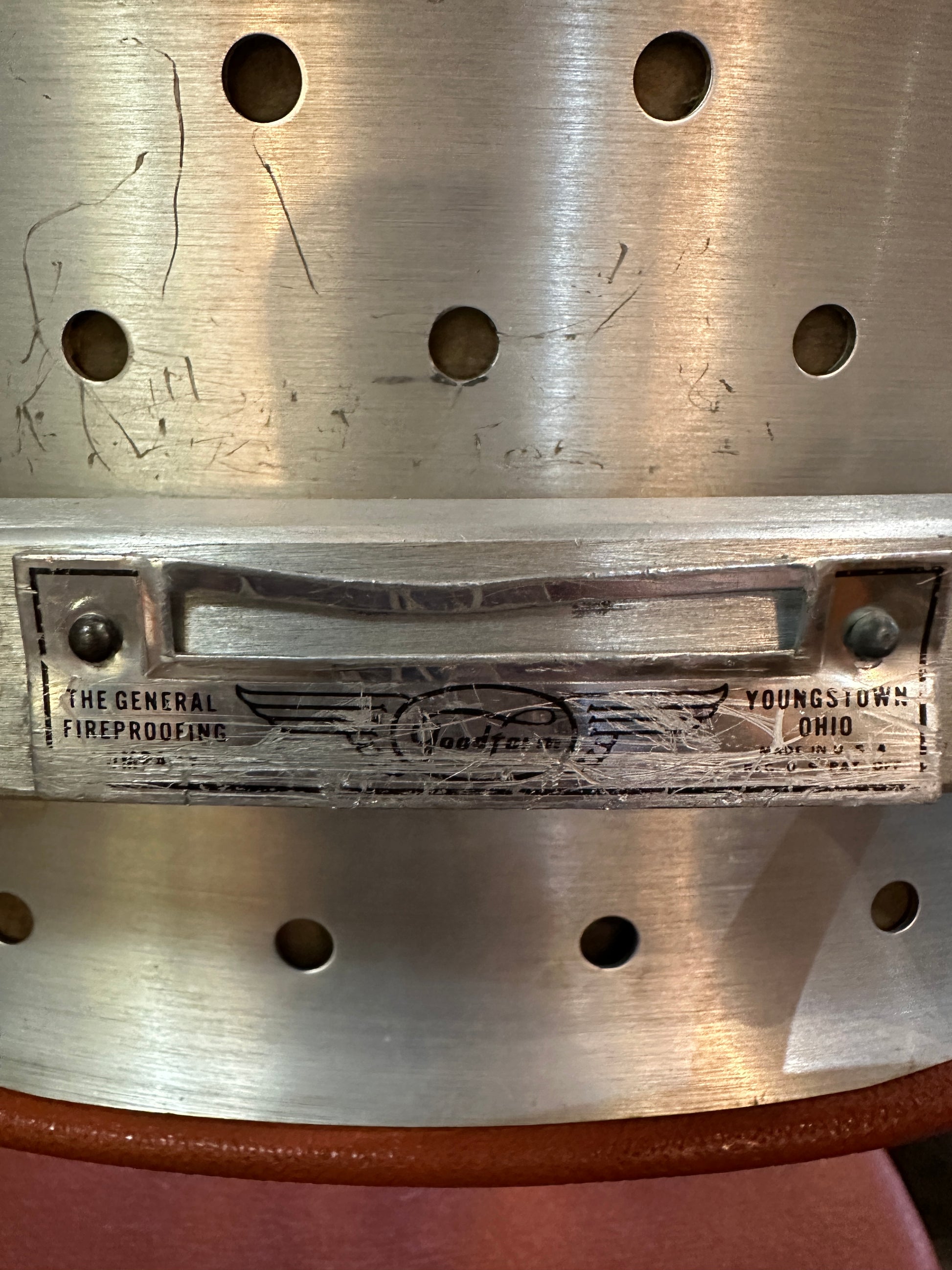 DESIGNED BY GIO PONTI IN 1936 FOR THE MONTECANTI BUILDING IN MILANO. BROUGHT TO THE US MARKET BY GOODFORM IN THE 1950S STEEL TUBE FRAME, ALUMINUM 4-STAR BASE, ORANGE VINYL SEAT AND BACK. THIS CHAIR WAS MADE FOR THE GENERAL FIREPROOFING COMPANY IN YOUNGSTOWN, OHIO. HARD RUBBER WHEELS ON CASTERS.