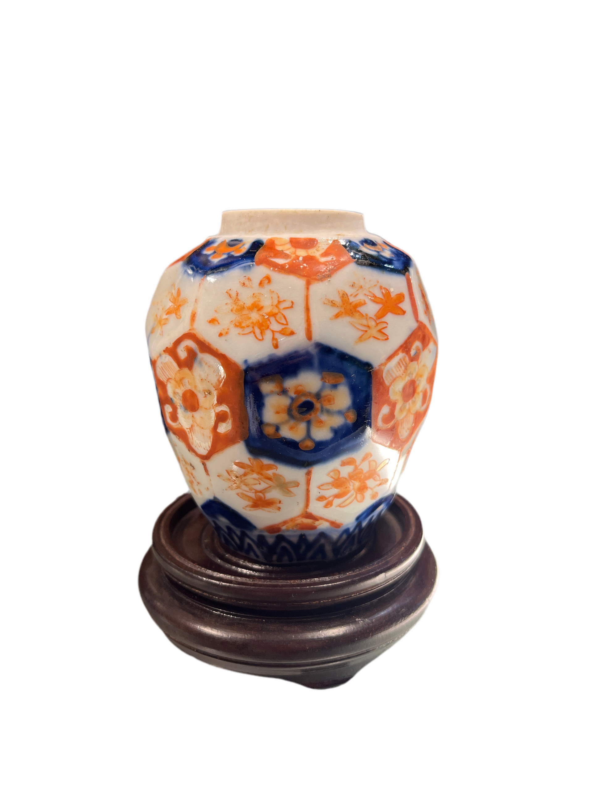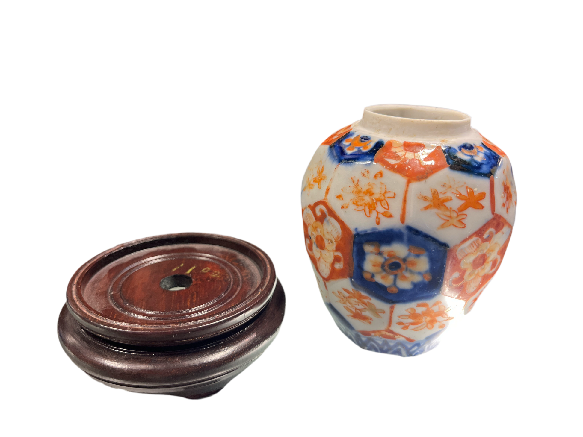 5” JAPANESE PORCELAIN IMARI WARE VASE WITH POLISHED WOODEN STAND. GENTLY USED