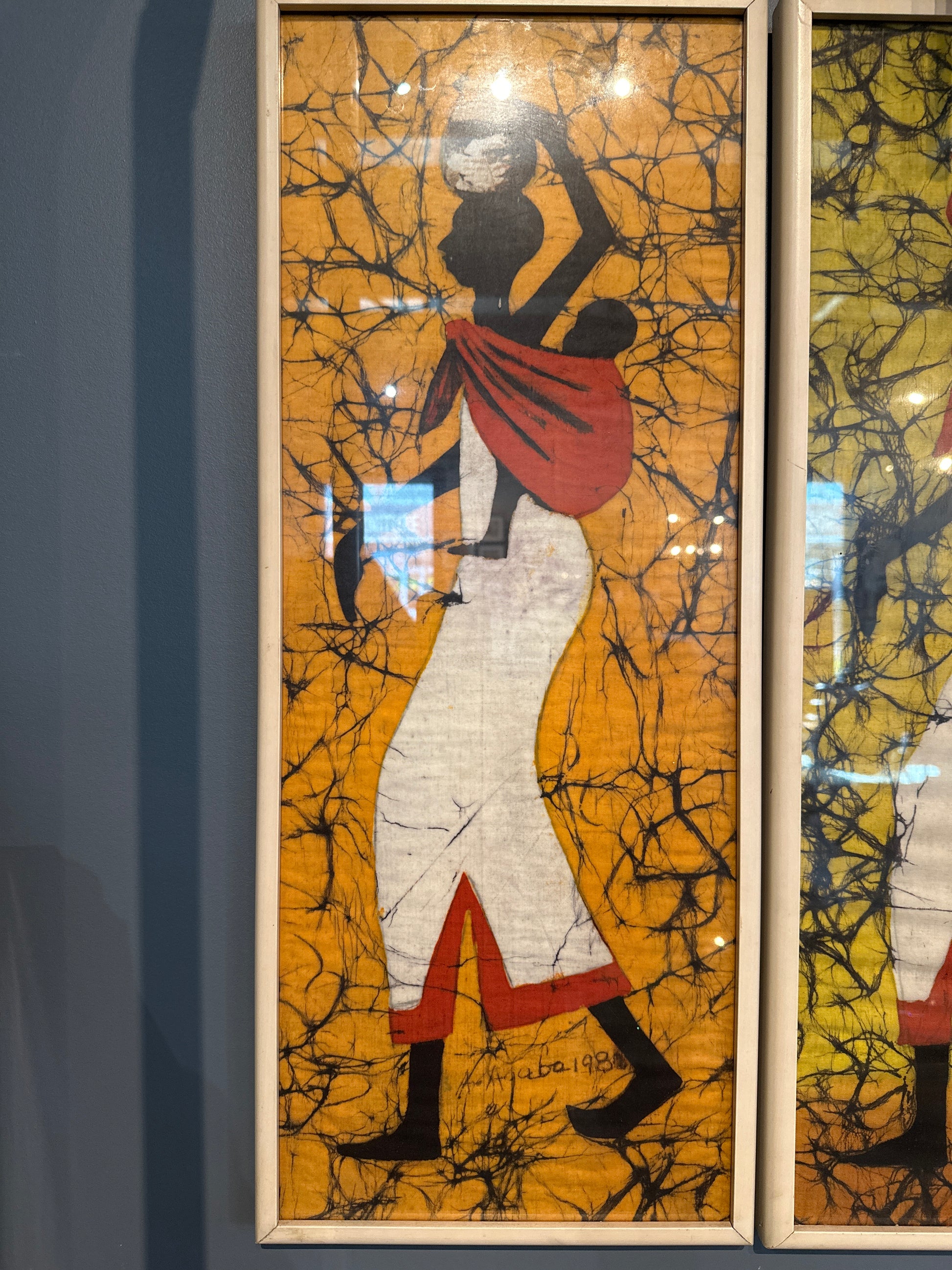 Each piece depicts mother carrying child on back and jug on head. One has orange background and the other is yellow/green.