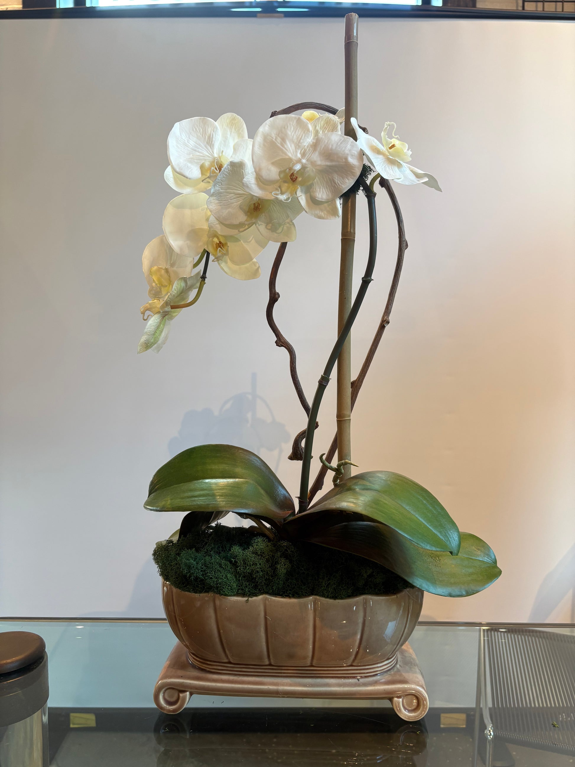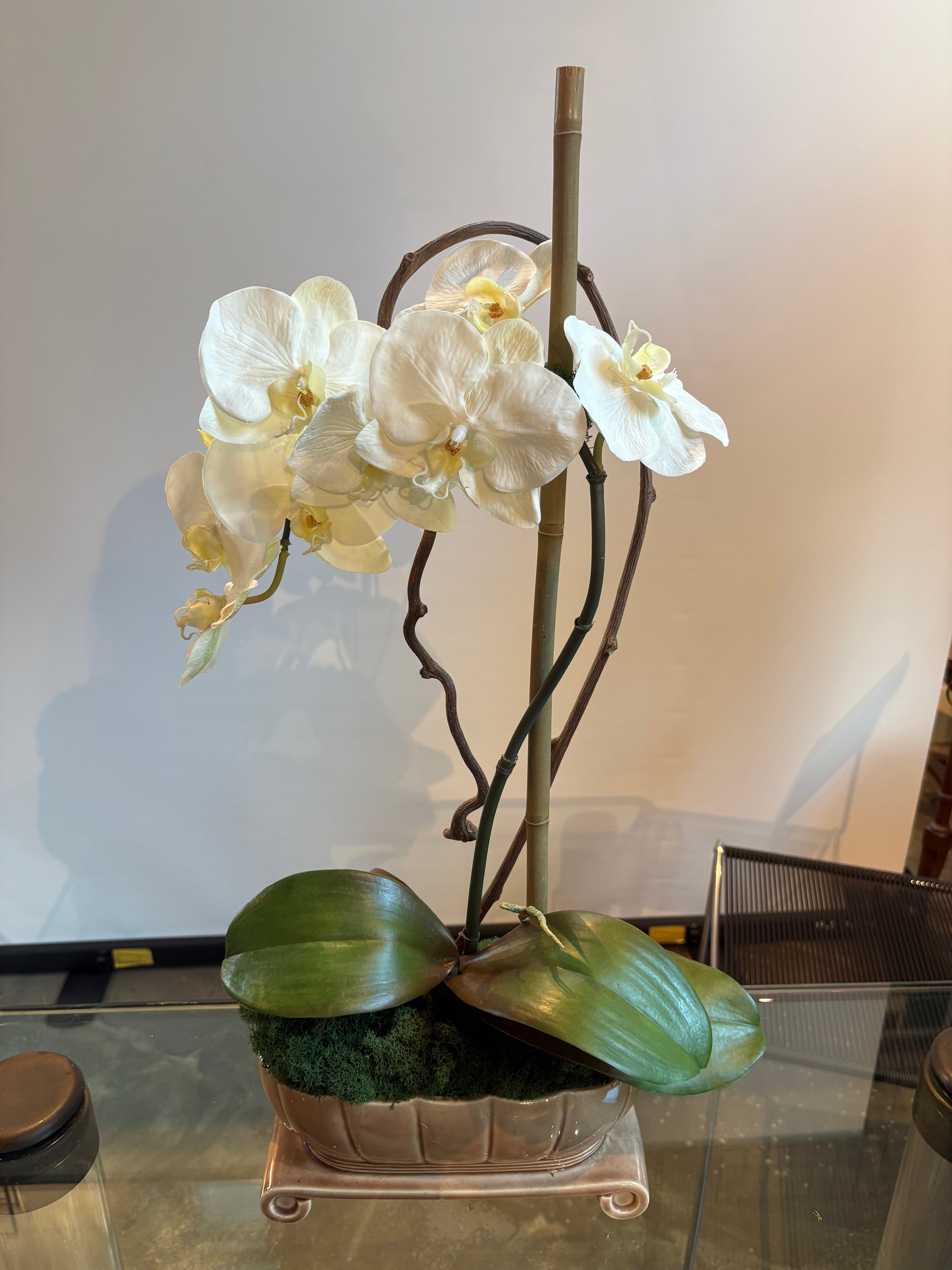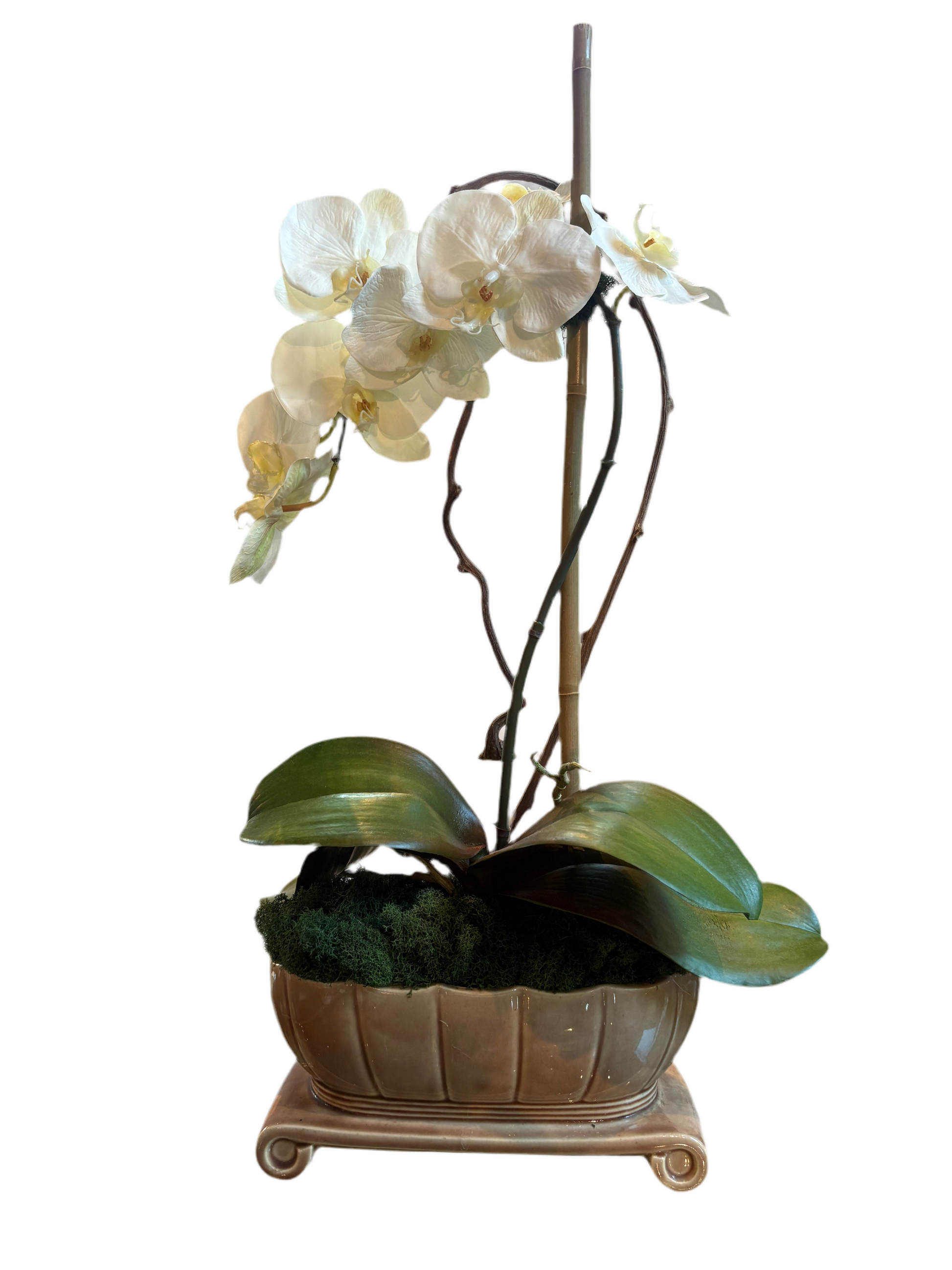 VINTAGE CHARM FAUX ORCHID ARRANGEMENT IN A POTTERY PLANTER. WORKS AS A LOVELY CENTERPIECE TO ADD A TOUCH OF BOHO CHIC TO YOUR HOME!