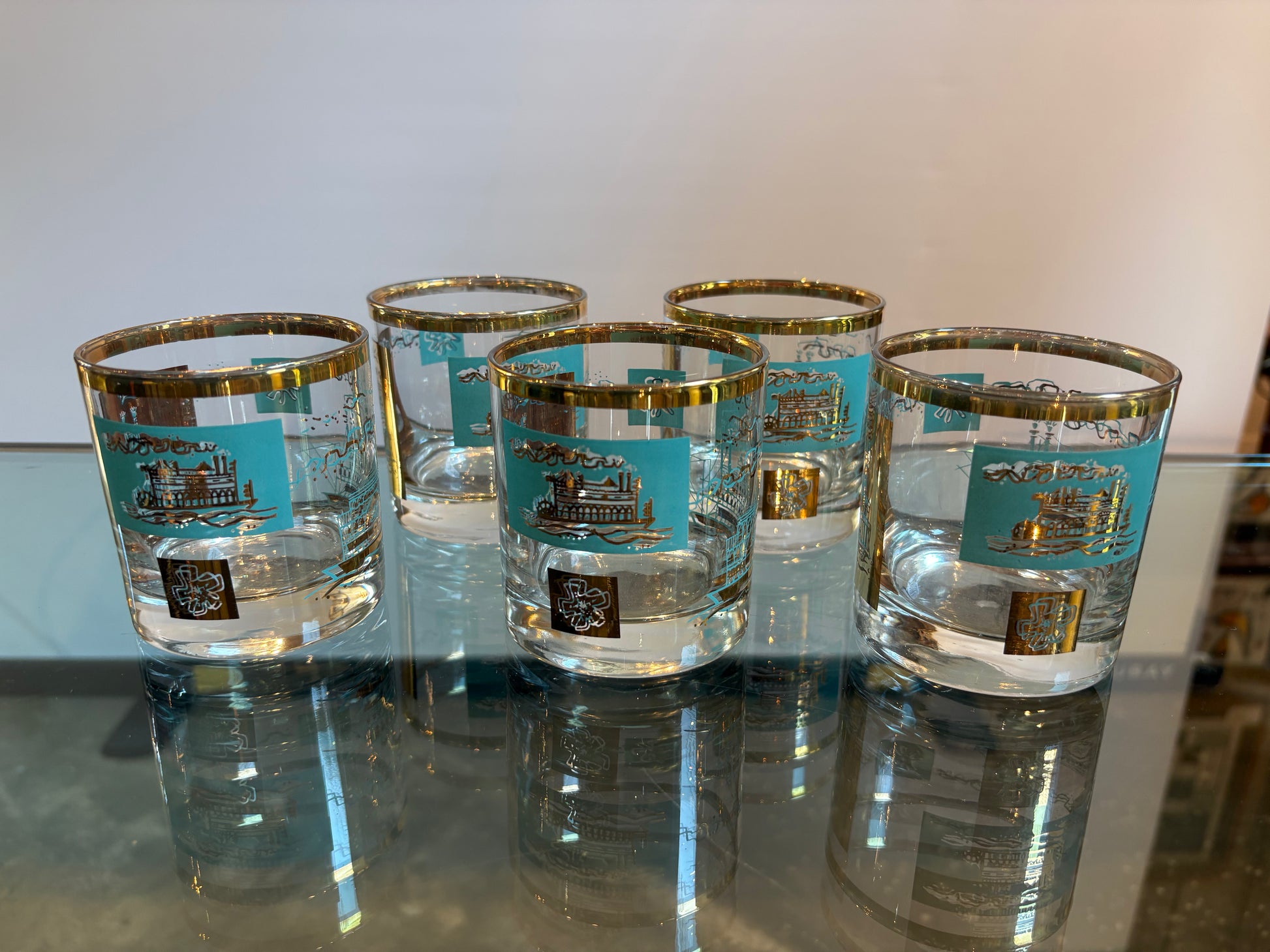 SET OF 5 TURQUOISE AND GOLD LIBBY STEAMBOAT GLASSES