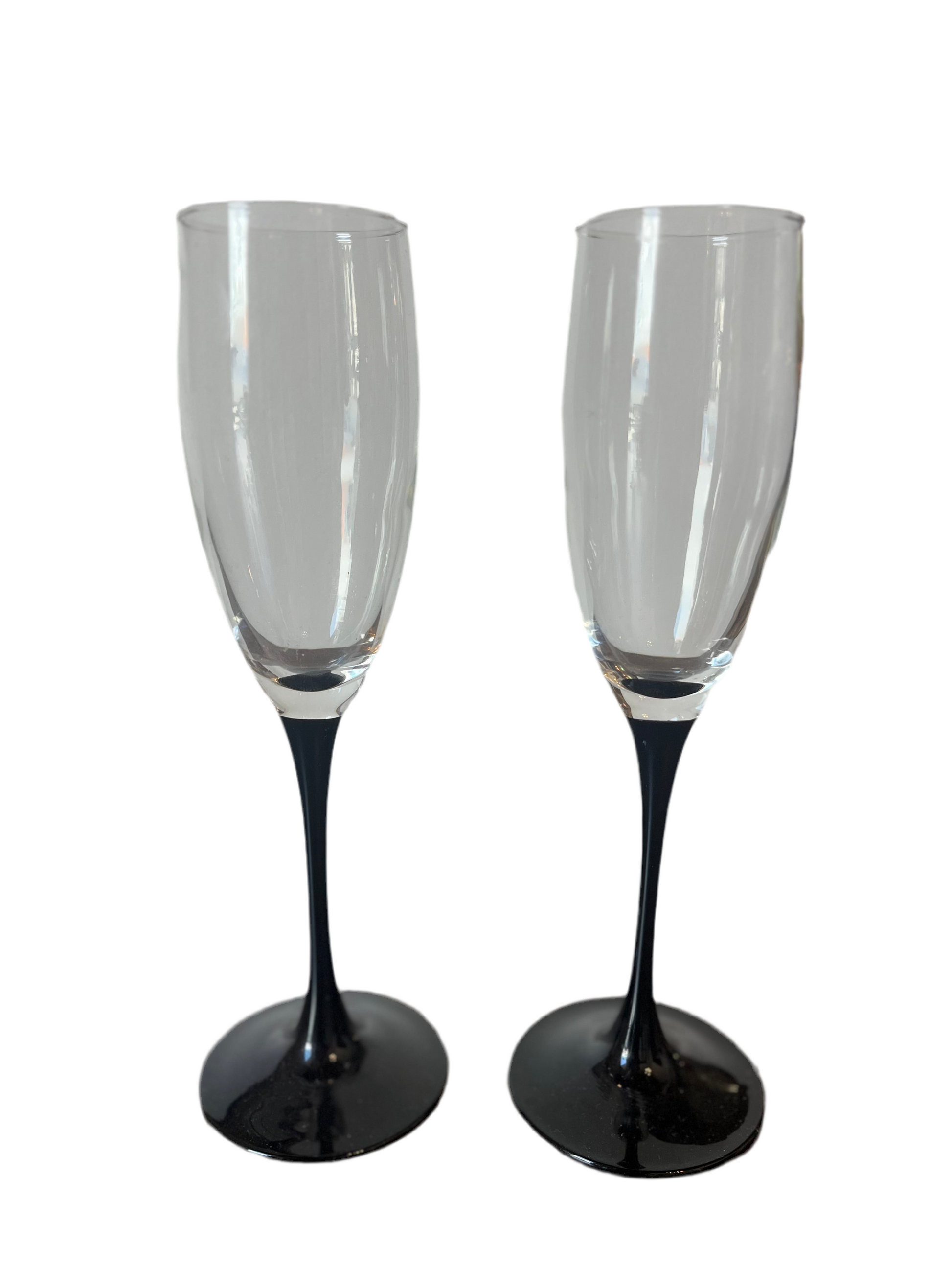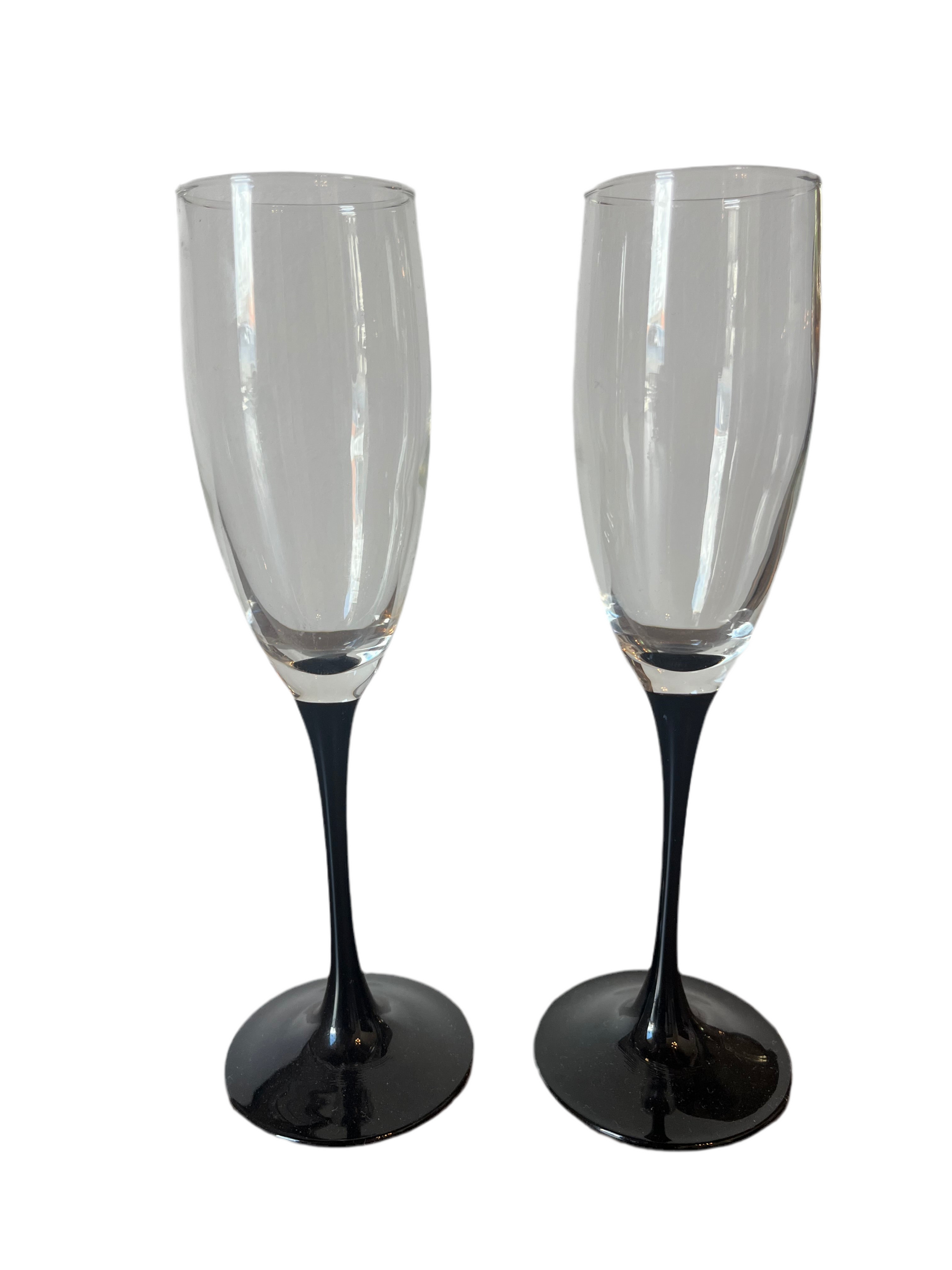 PAIR OF 8.5” VINTAGE BLACK STEM CHAMPAGNE GLASSES