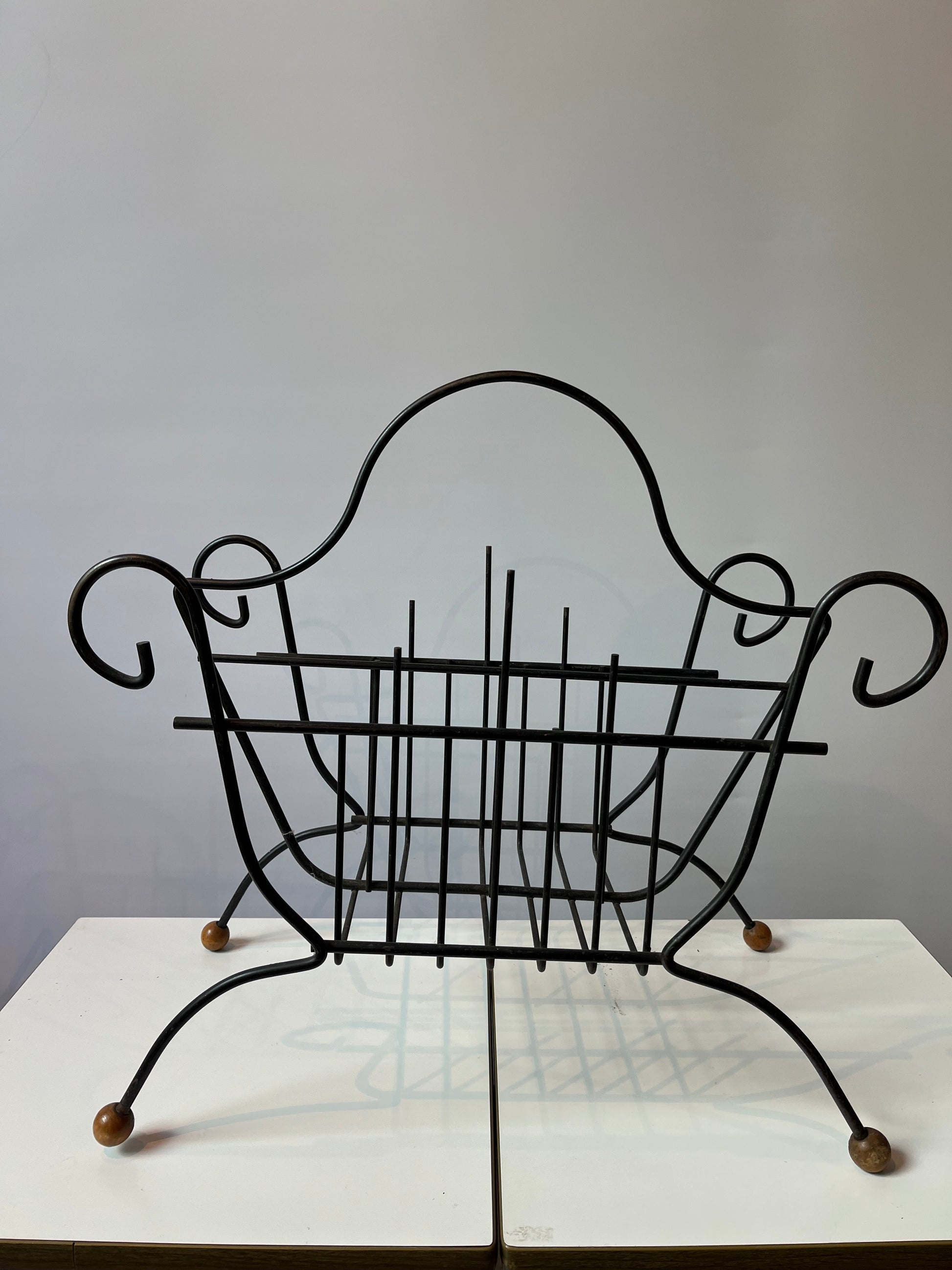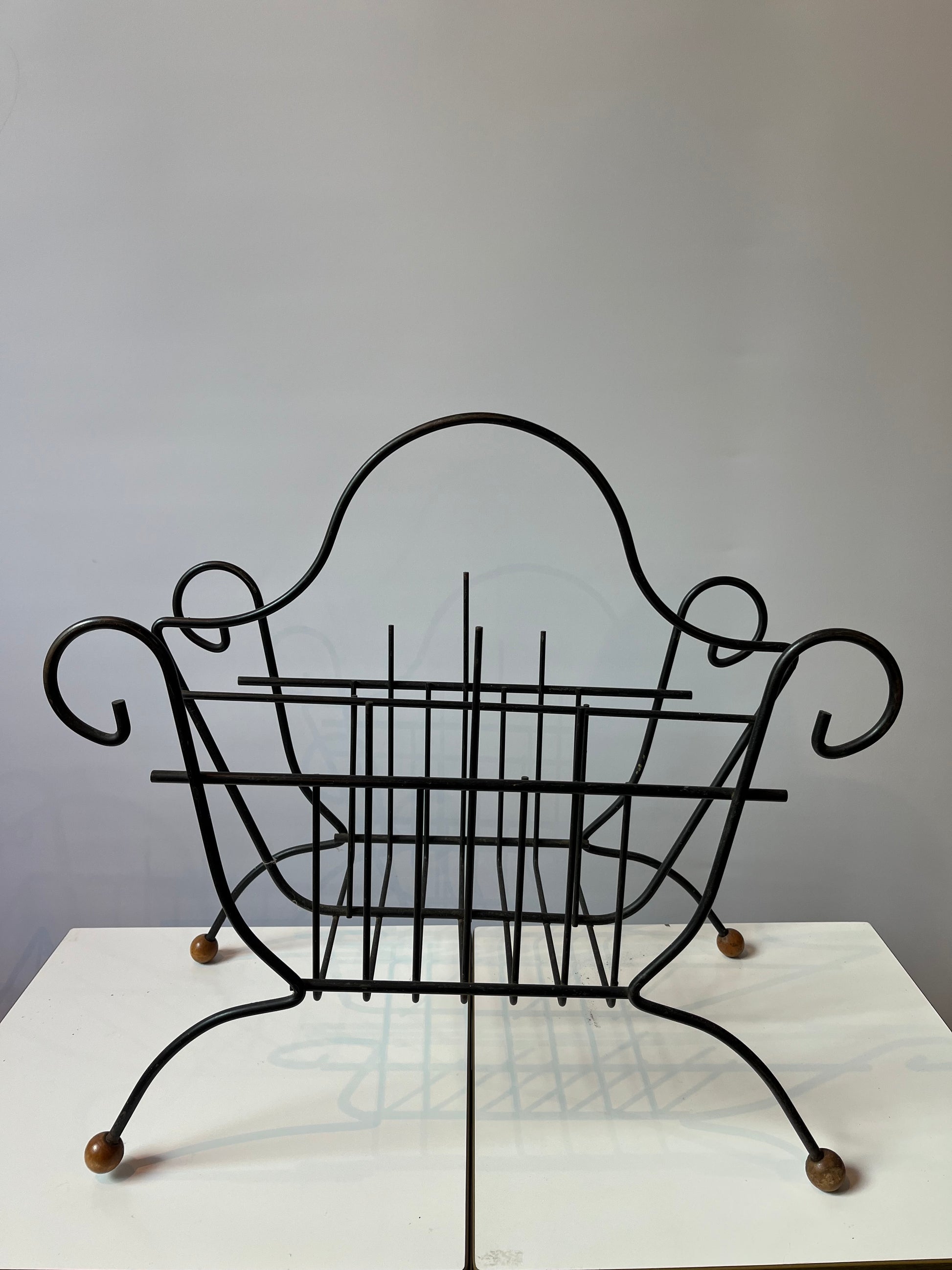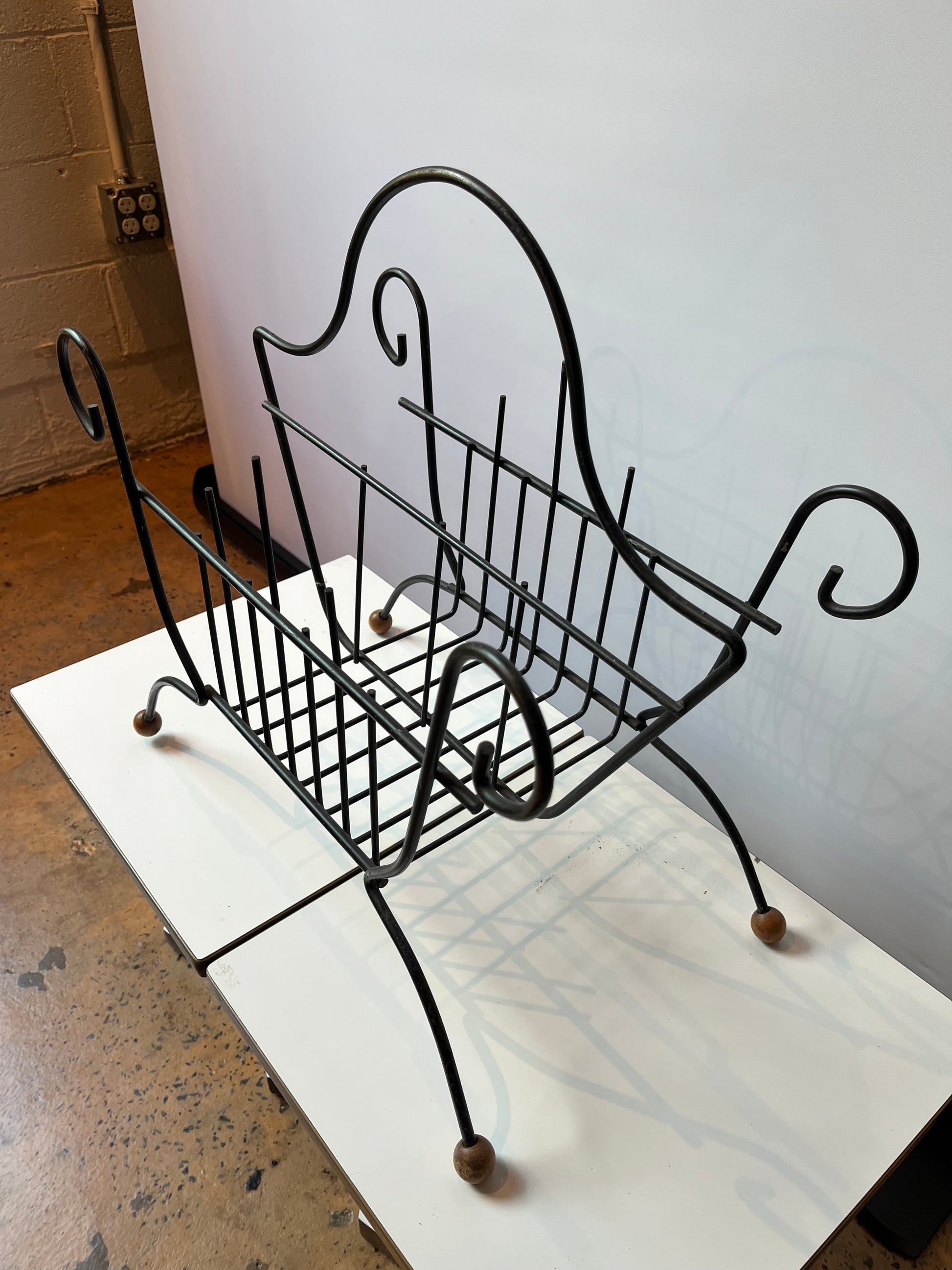 10” W x 21” L x 21.25” H VINTAGE IRON MAGAZINE RACK WITH WOOD STOPPERS
