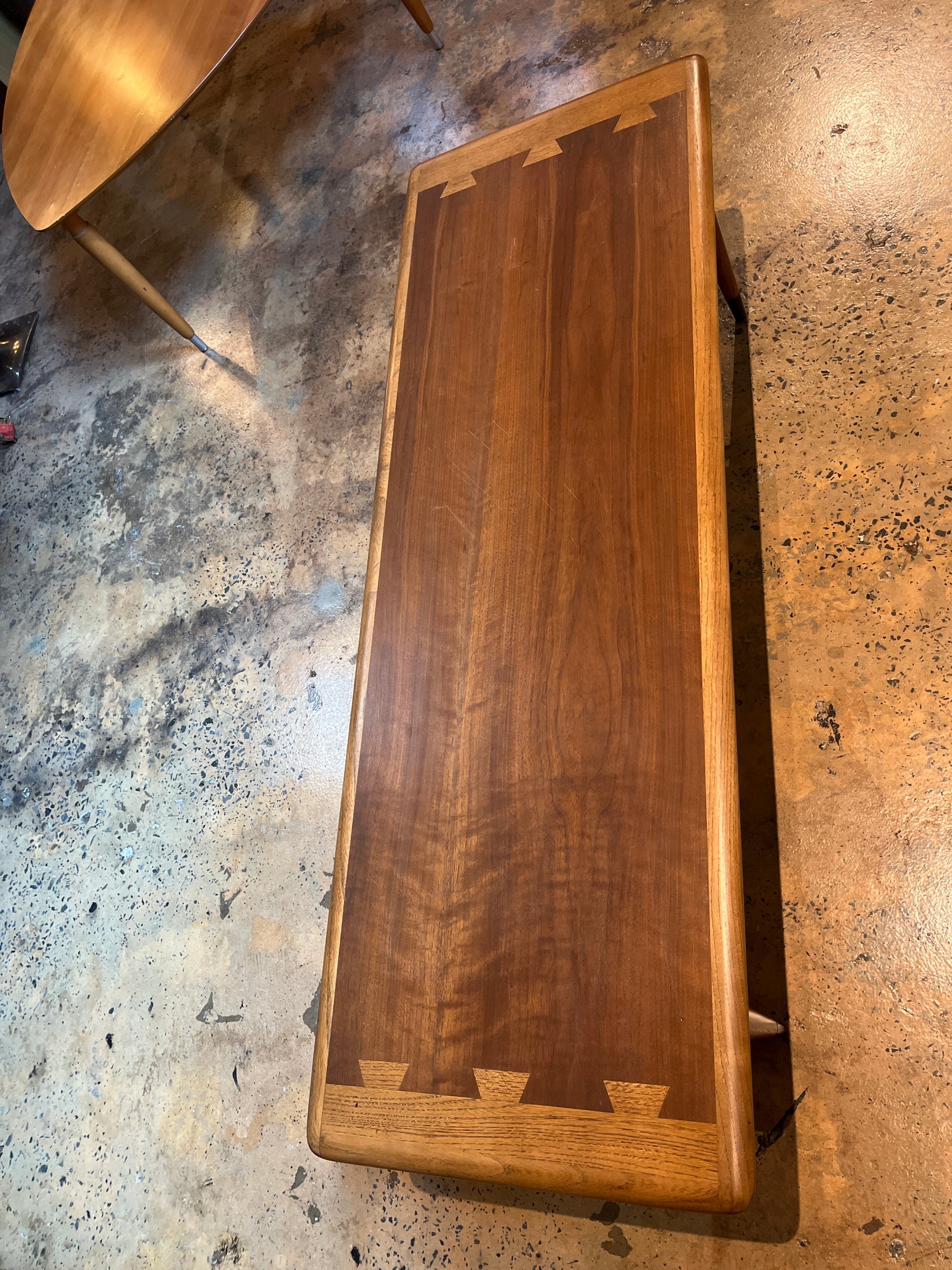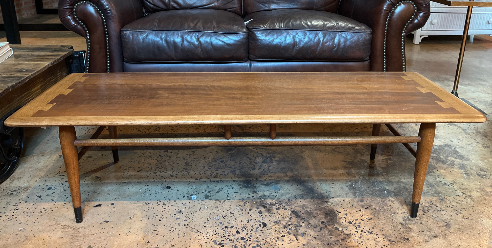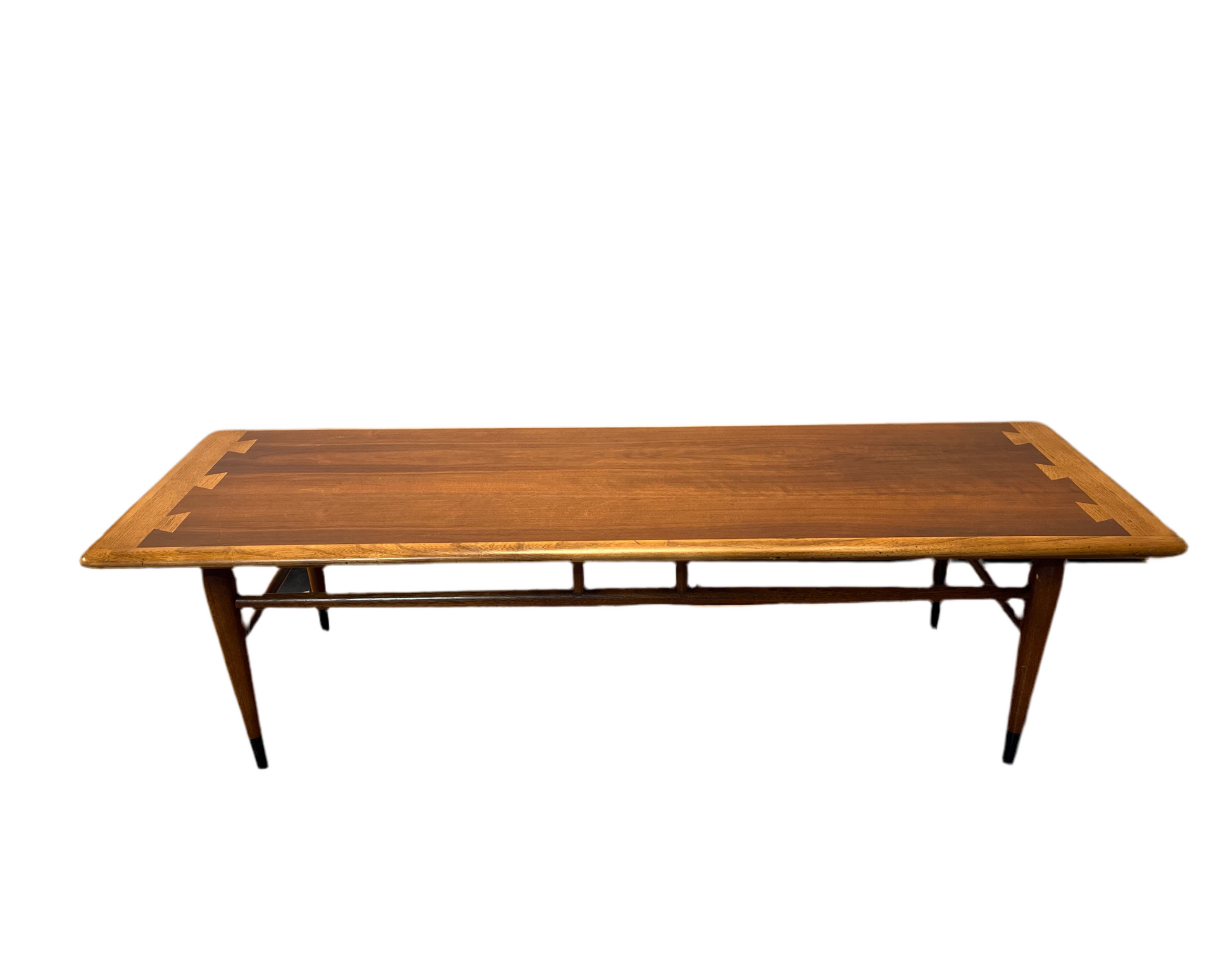 VINTAGE 1960s LANE ACCLAIM COFFEE TABLE IN FRUITWOOD WITH A DOVETAILED INLAY DESIGN AND TAPERED LEGS. TABLE CONTAINS A FEW MINOR SCRATCHES AND IMPERFECTIONS AS PICTURED, WHILE STILL HAVING AN OVERALL APPEARANCE OF VERY GOOD CONDITION.