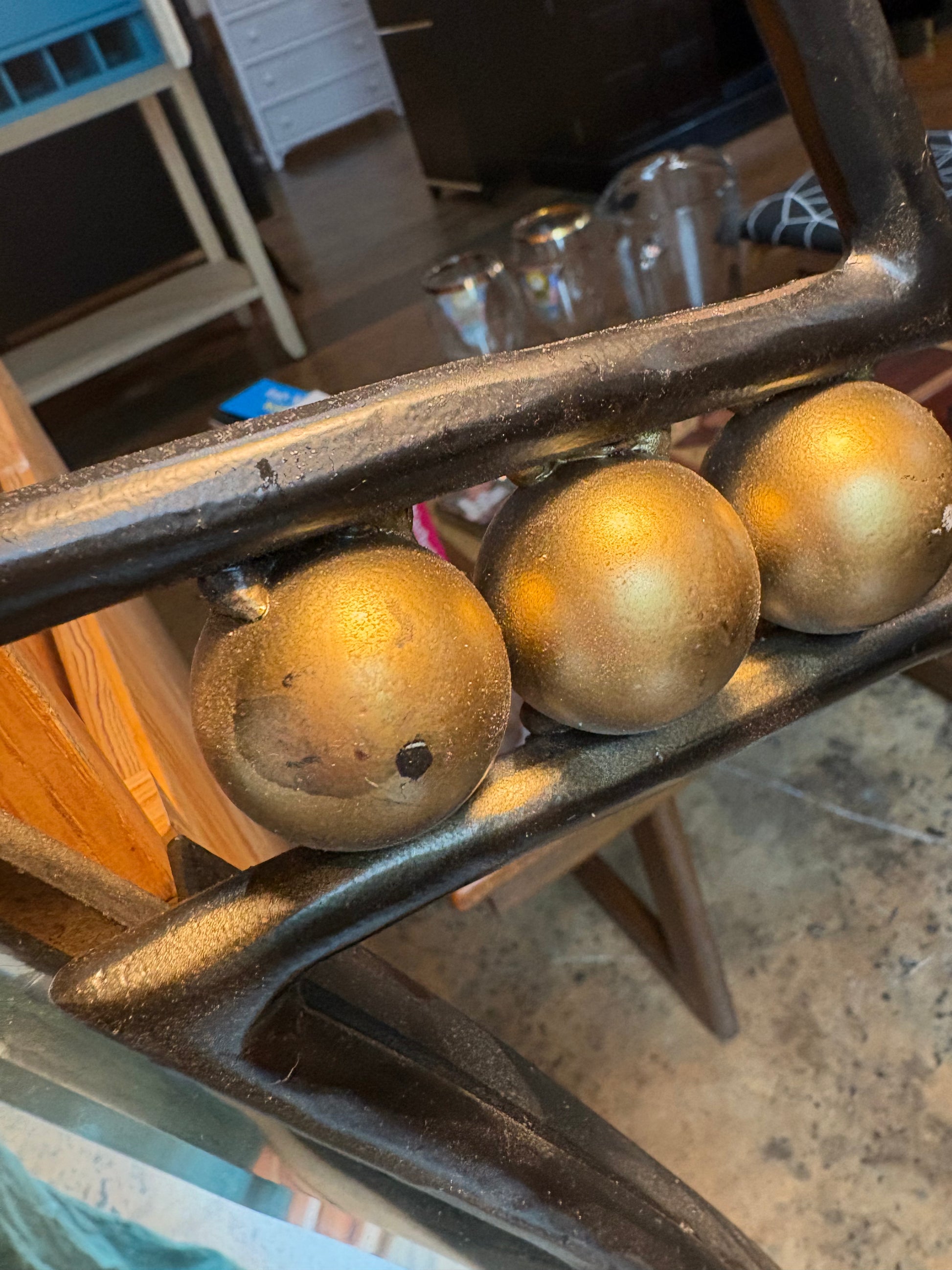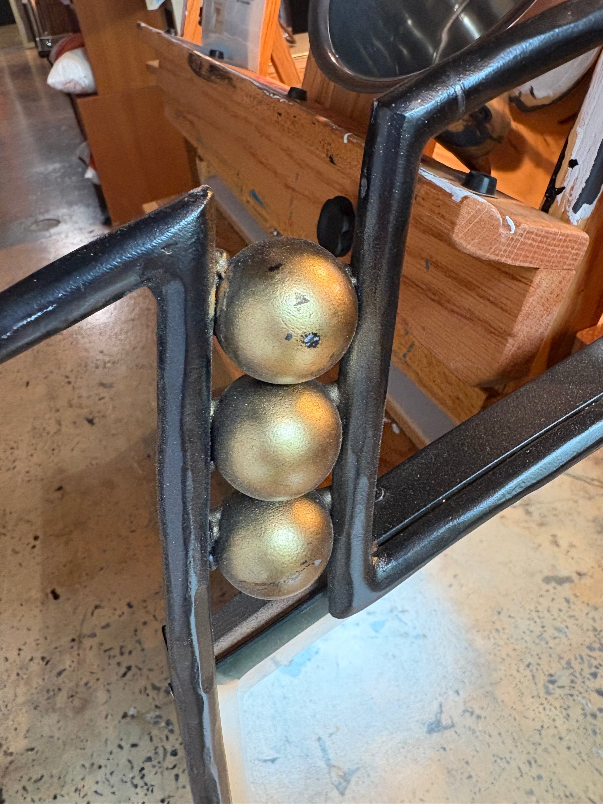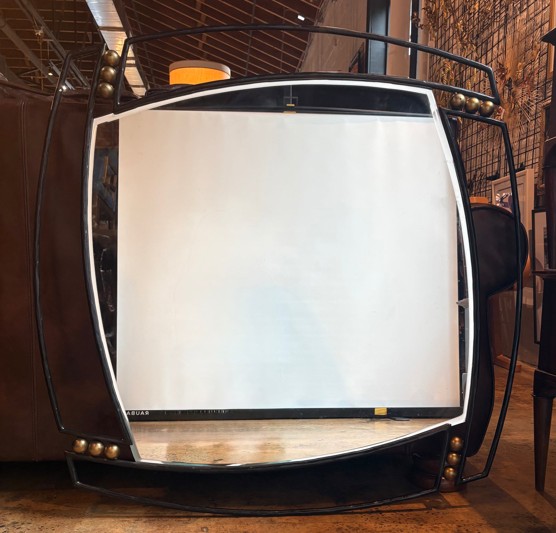 40” x 40” Roxy mirror by Wildwood, crafted from durable forged iron and adorned with brass ball accents for a touch of modern elegance. The asymmetric, open frame design offers a contemporary flair that will complement any room, from living spaces to entryways. With its versatile construction, this mirror can be hung in multiple orientations. This mirror is in great used condition with very few signs of wear or tear, aside from some small chips in the brass elements (see photos).