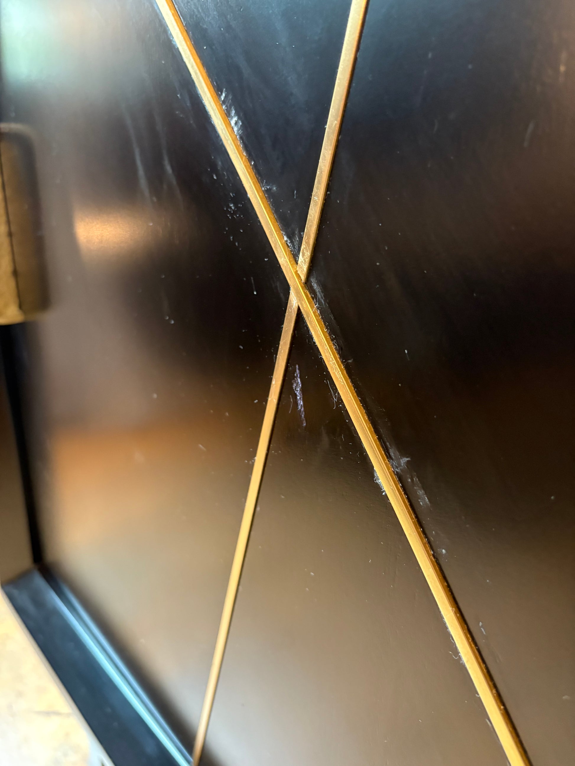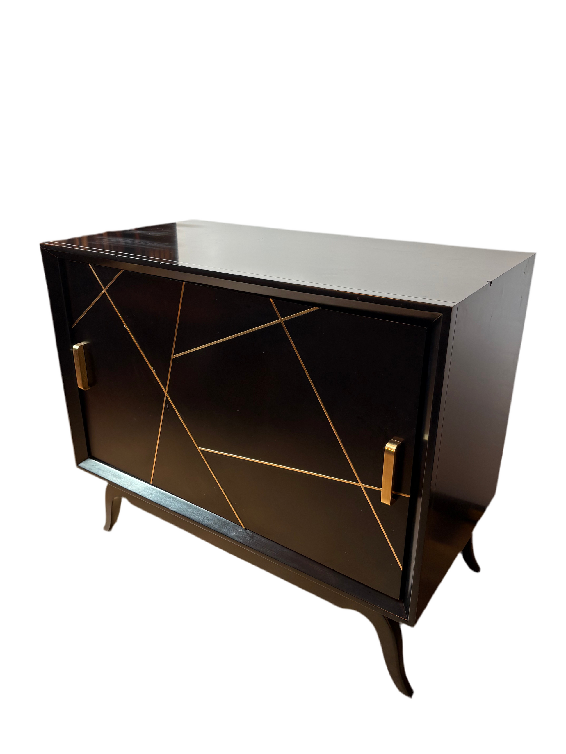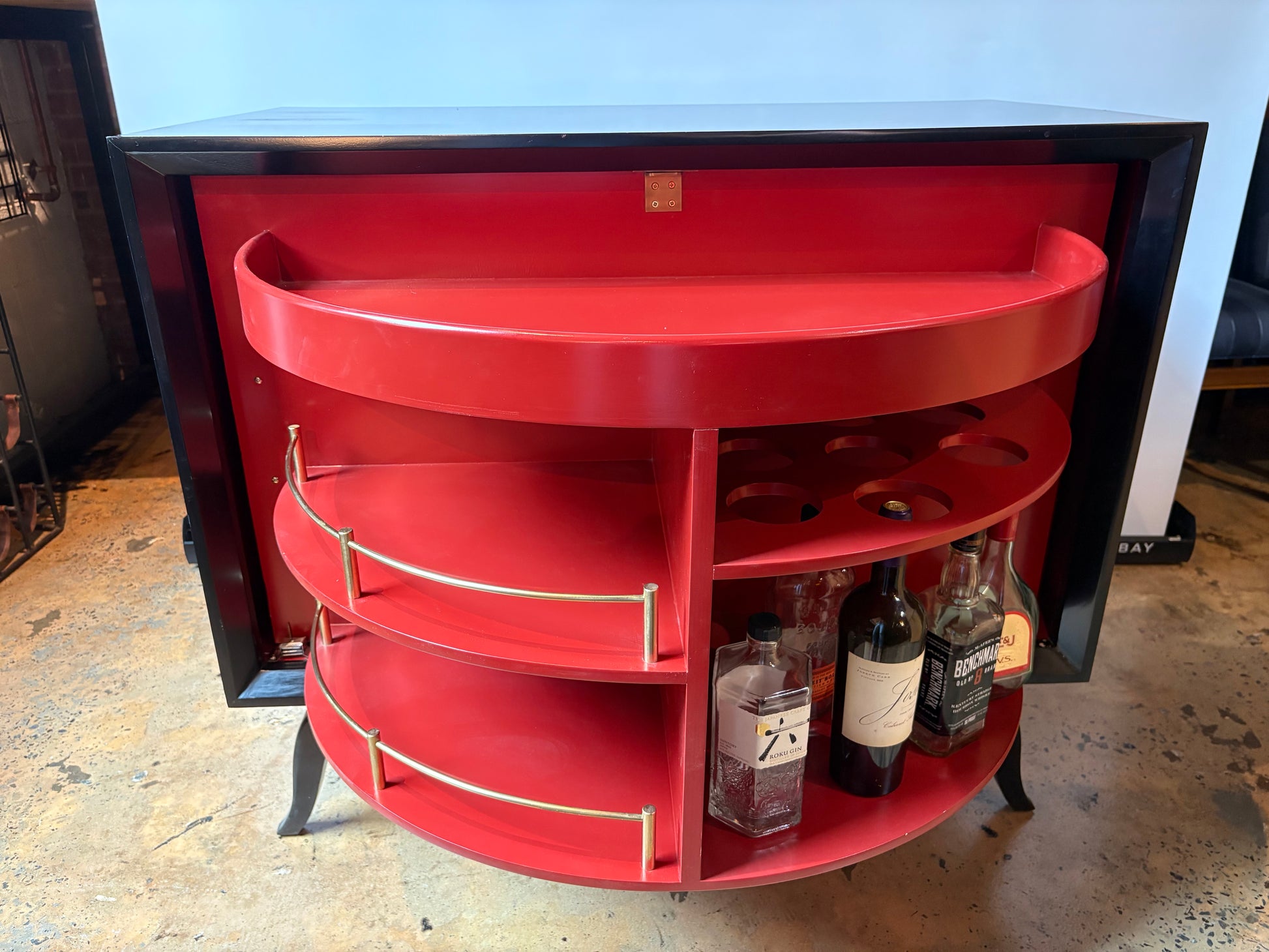 Wildwood Sinatra Black Bar Cabinet with rotating front in a Hollywood regency-style black with gold accents and hardware. Full rotating door reveals bar display with holes for storing glasses, wine and spirits. This design combines gravitas and function, with bold colors and a rotating display to put a unique twist on a traditional bar cabinet.