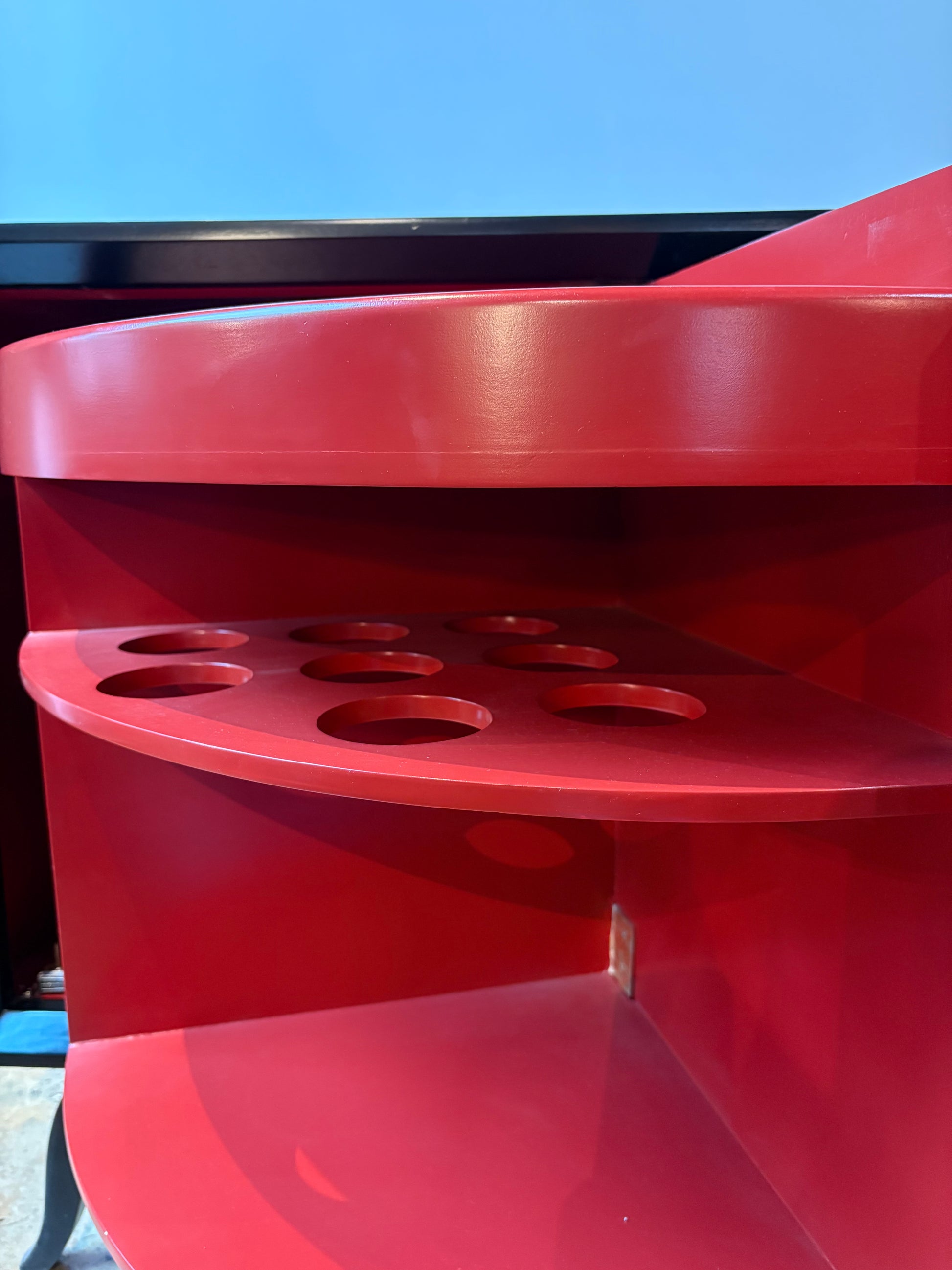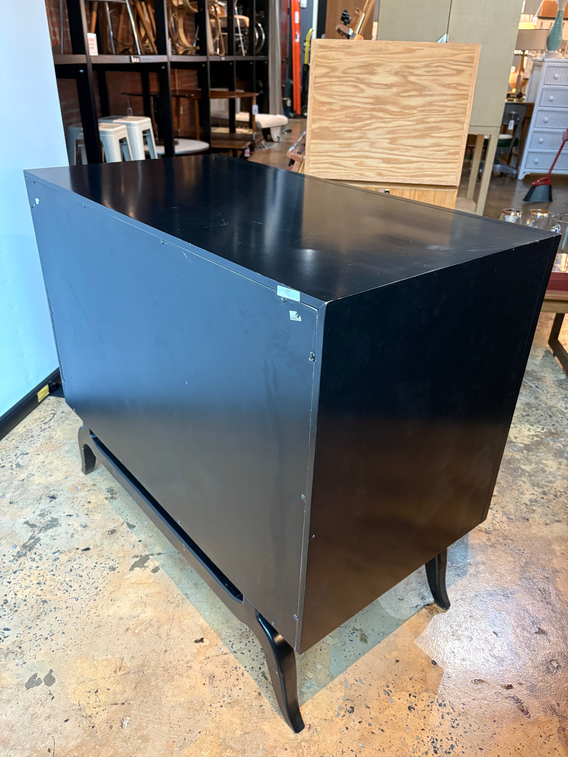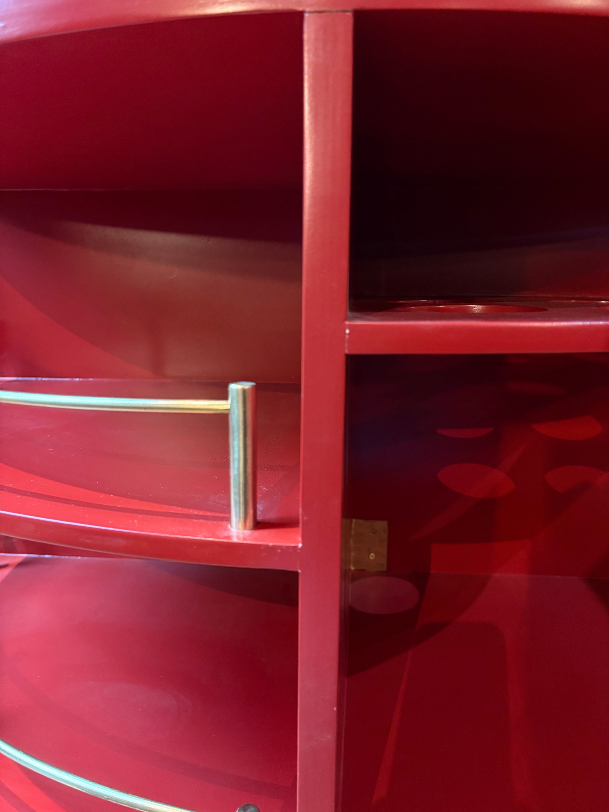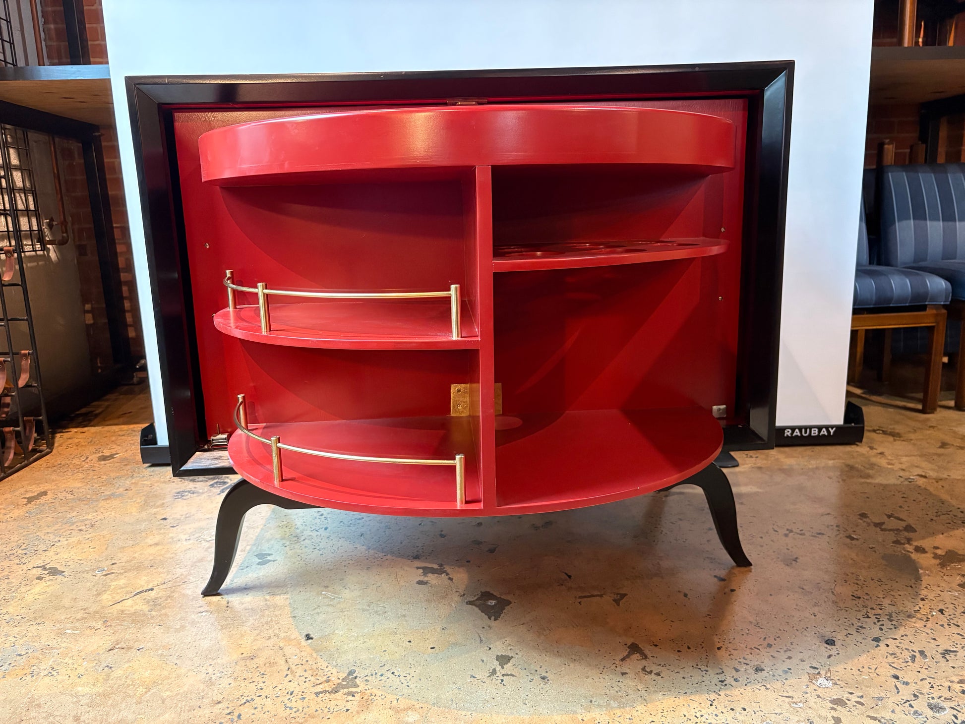 Wildwood Sinatra Black Bar Cabinet with rotating front in a Hollywood regency-style black with gold accents and hardware. Full rotating door reveals bar display with holes for storing glasses, wine and spirits. This design combines gravitas and function, with bold colors and a rotating display to put a unique twist on a traditional bar cabinet.