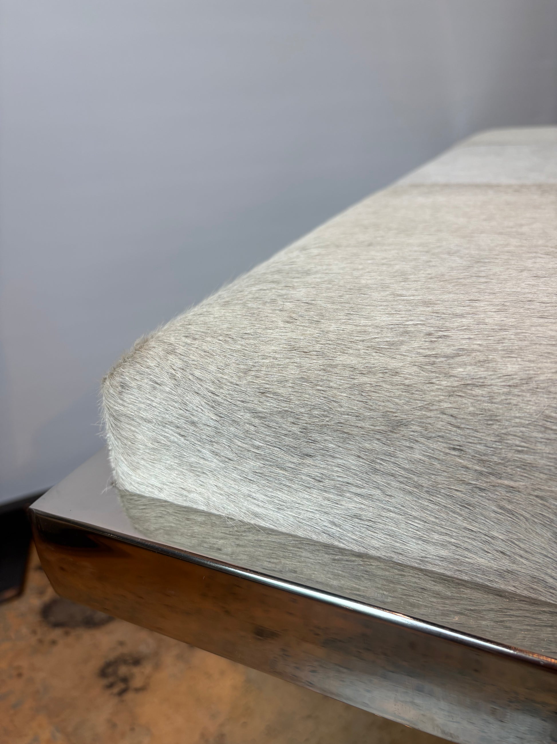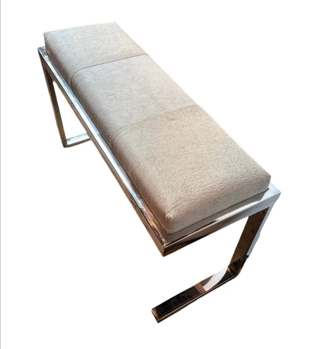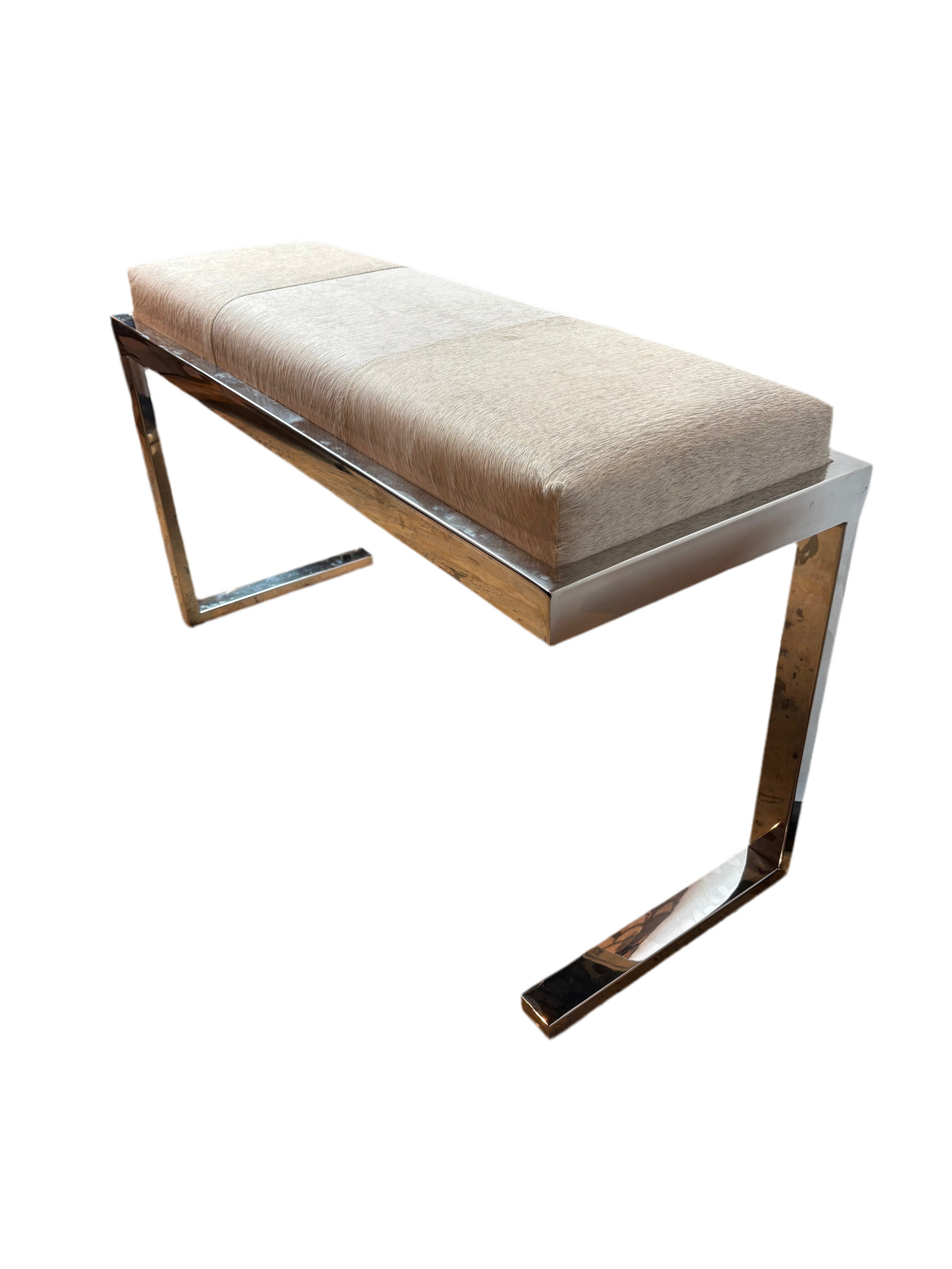 Silver horse hide upholstered chrome bench with asymmetrical legs, in excellent condition - like new.