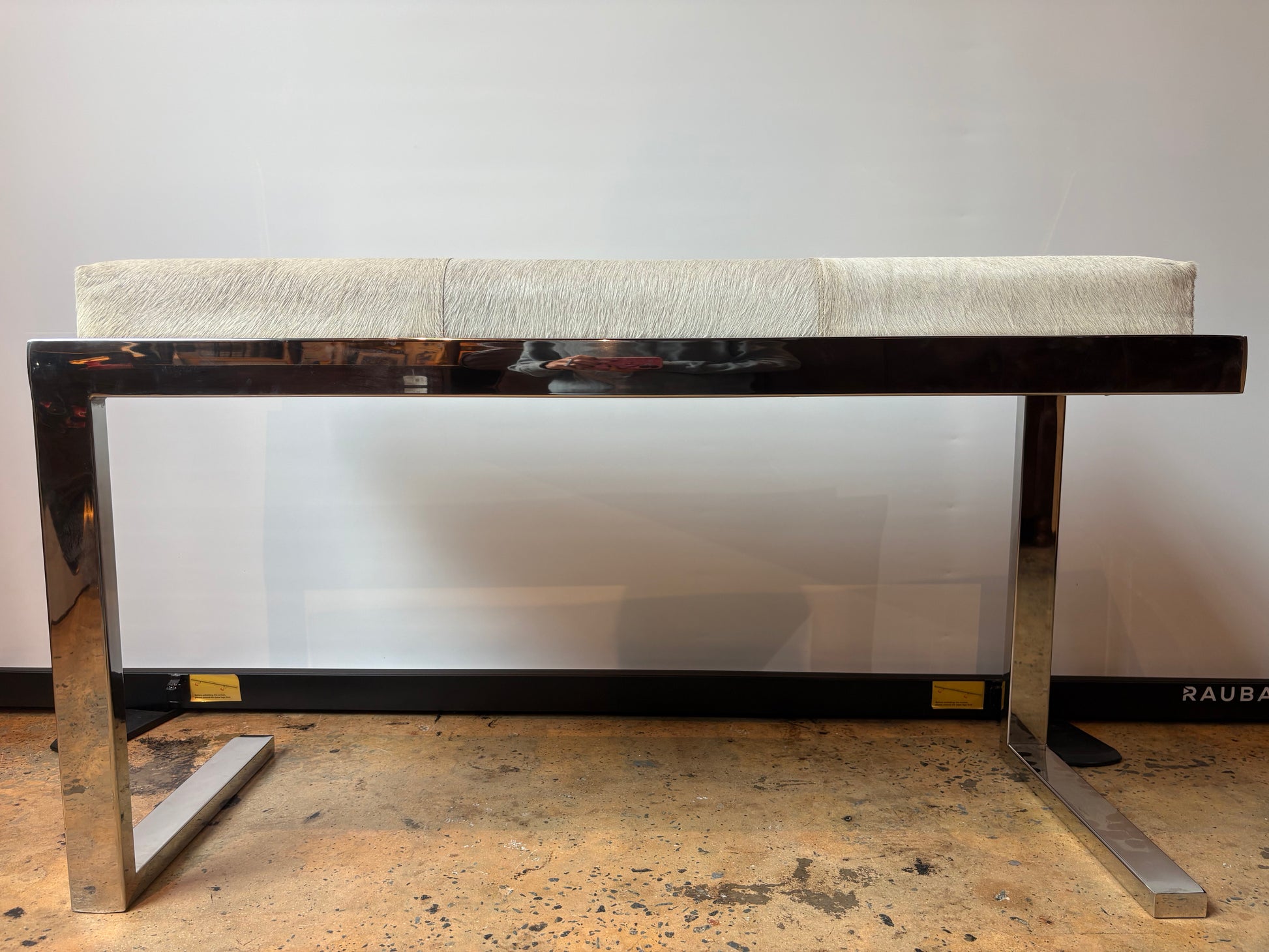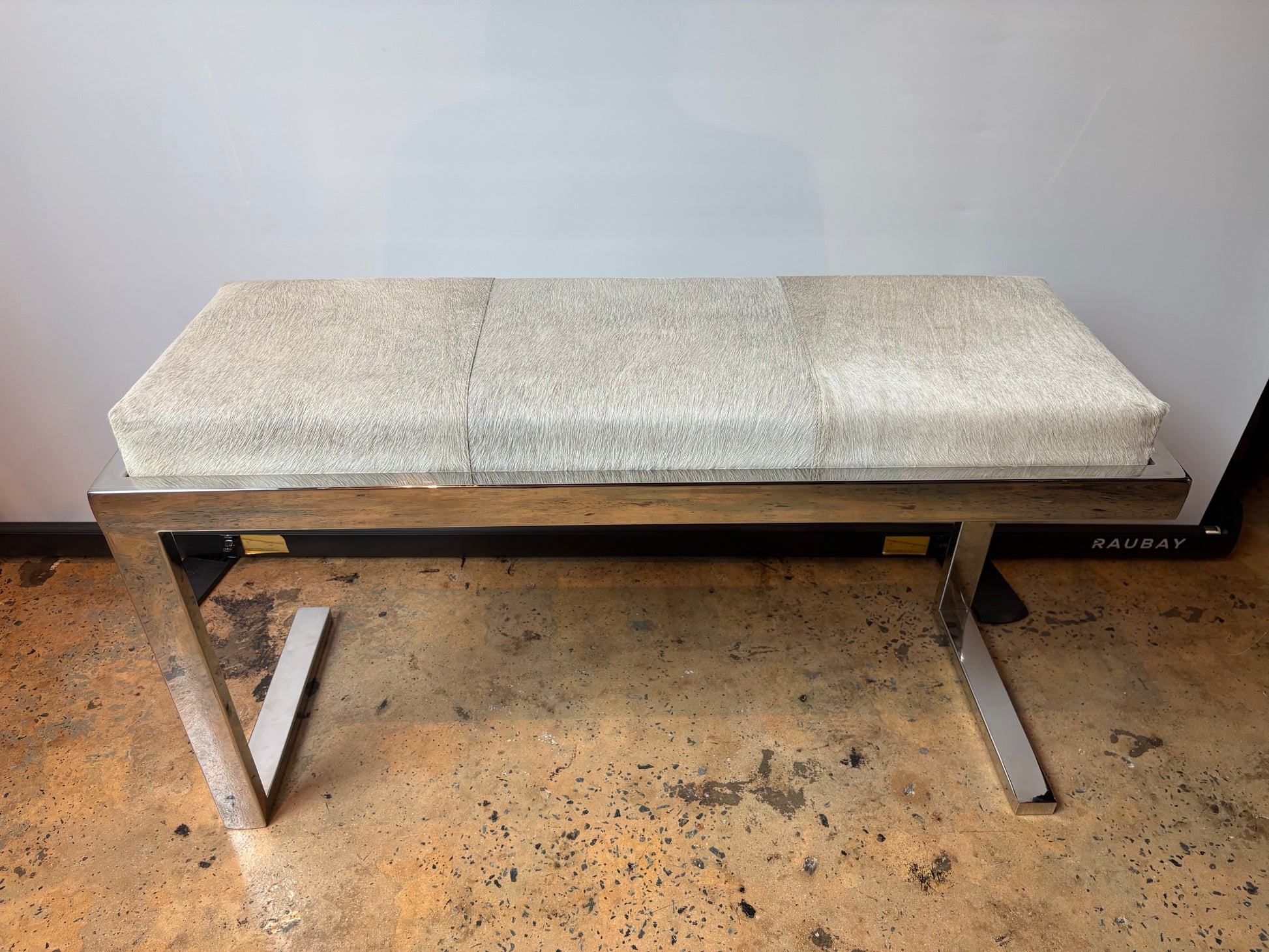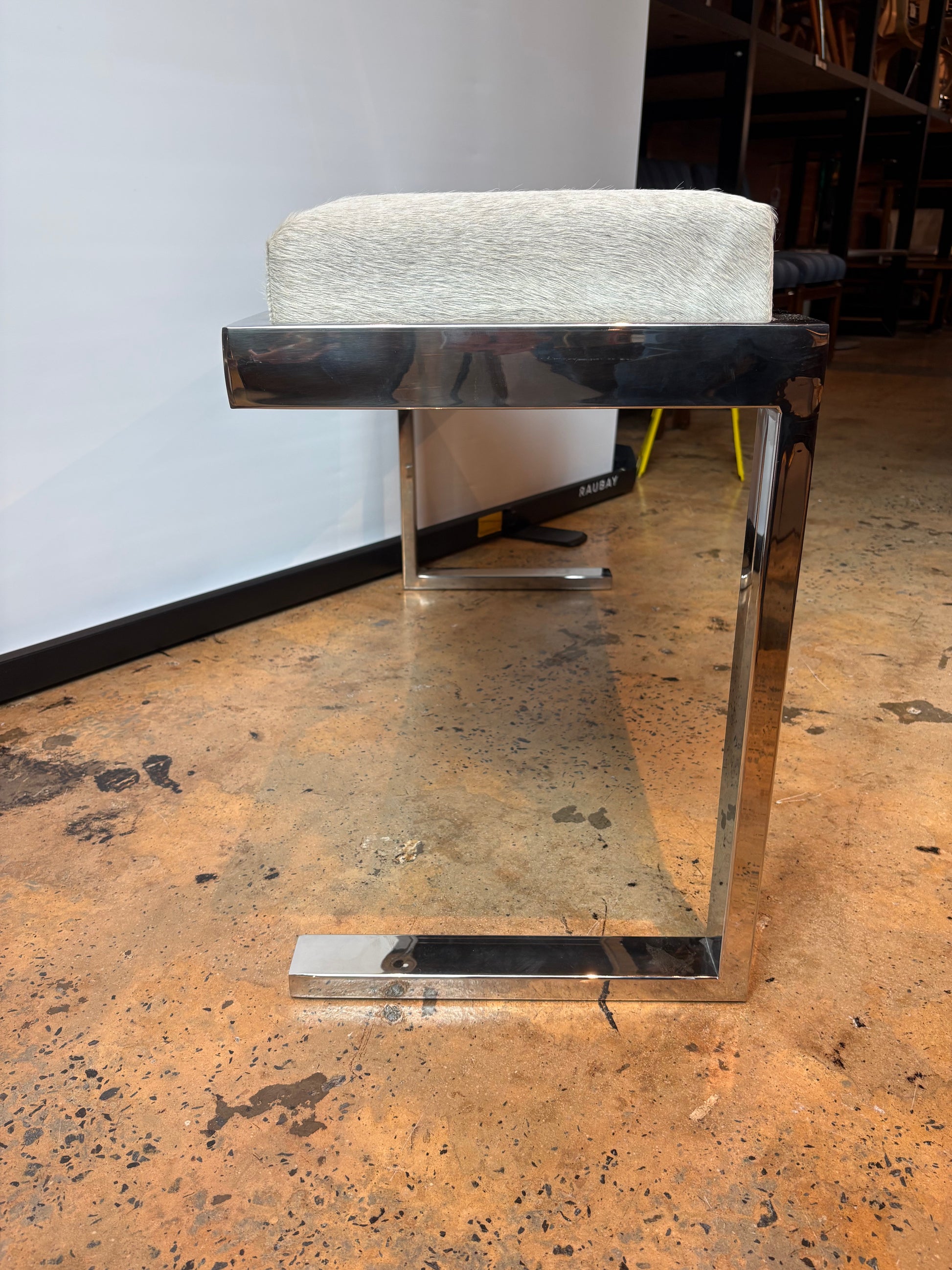 Silver horse hide upholstered chrome bench with asymmetrical legs, in excellent condition - like new.