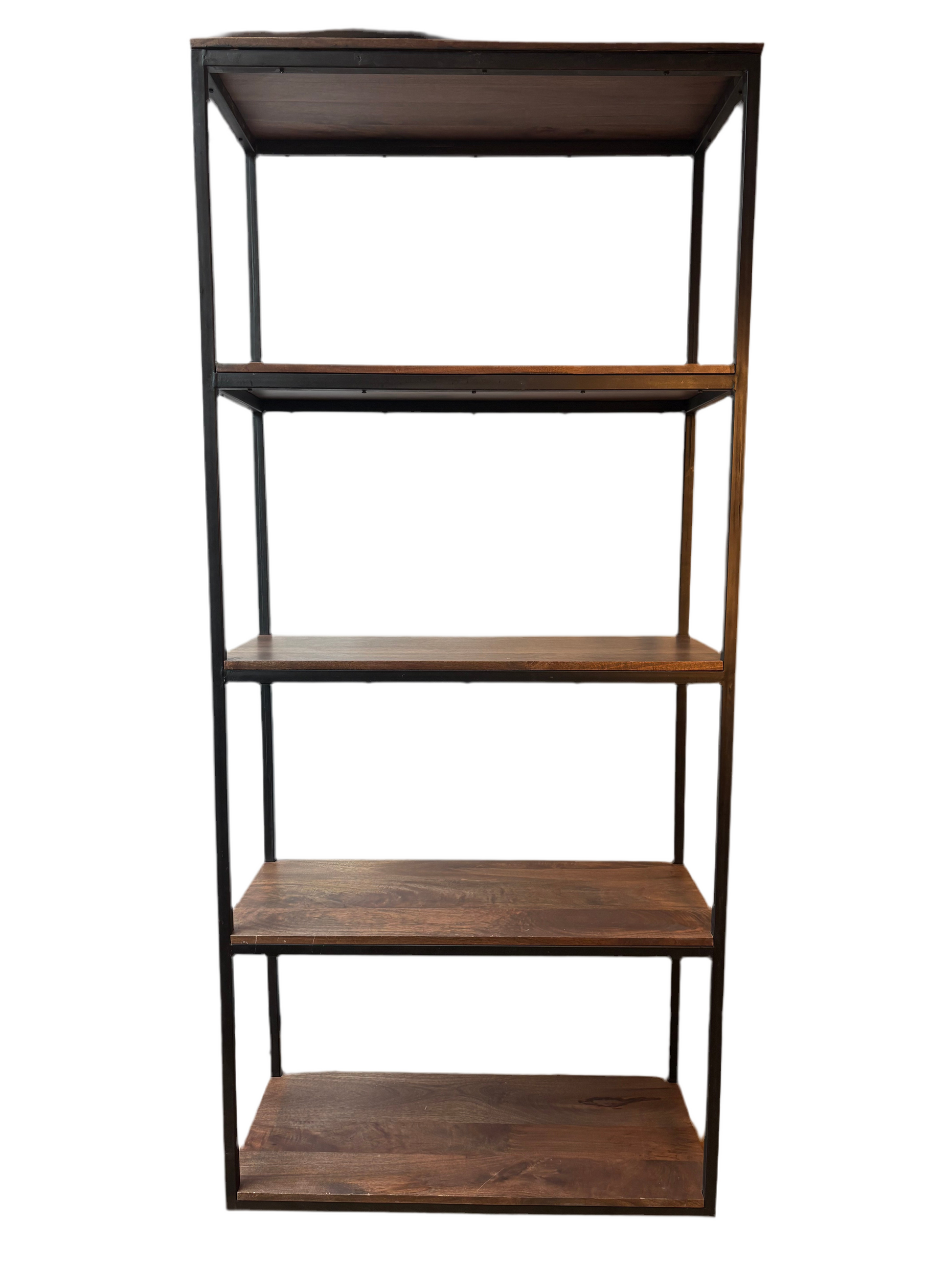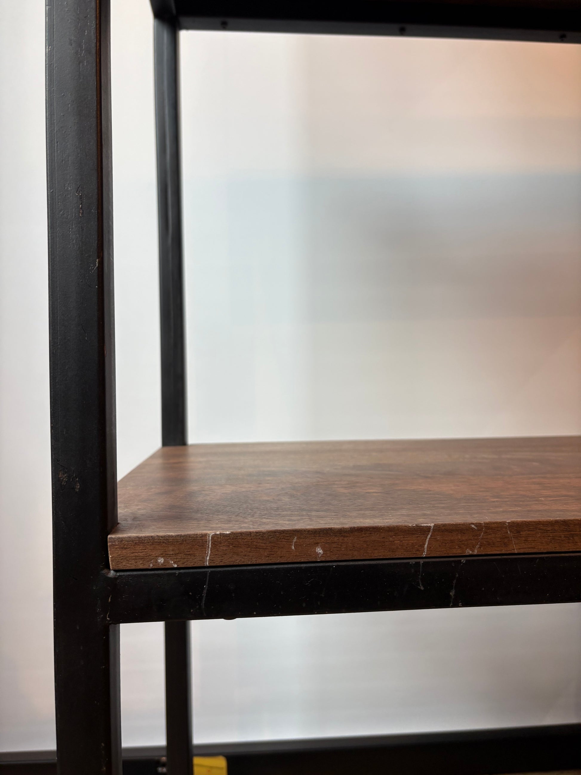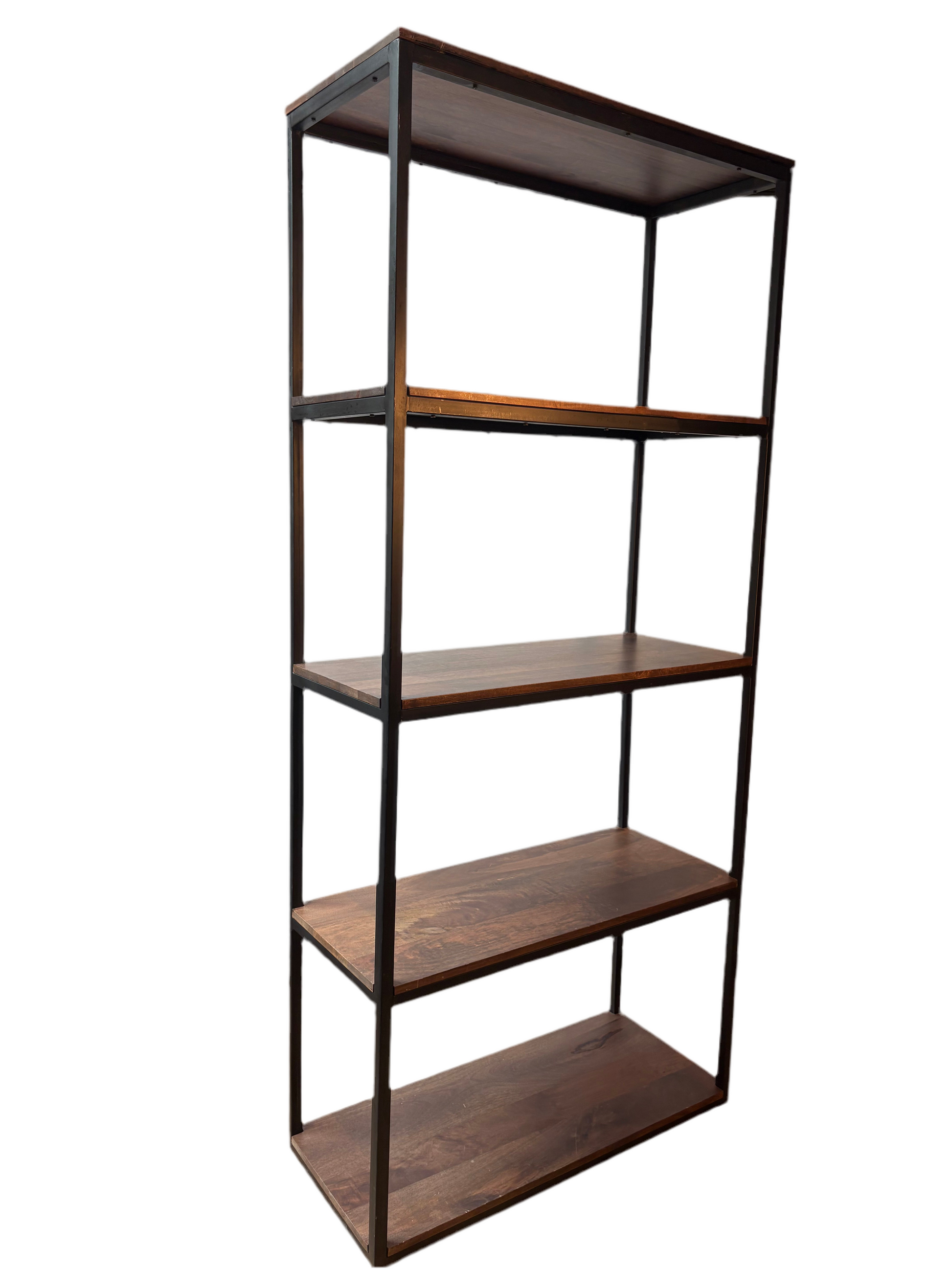 Large, Sturdy Wood & Metal 5-Tier Bookshelf in fair used condition with some small scuffs and scratches on the shelves.
