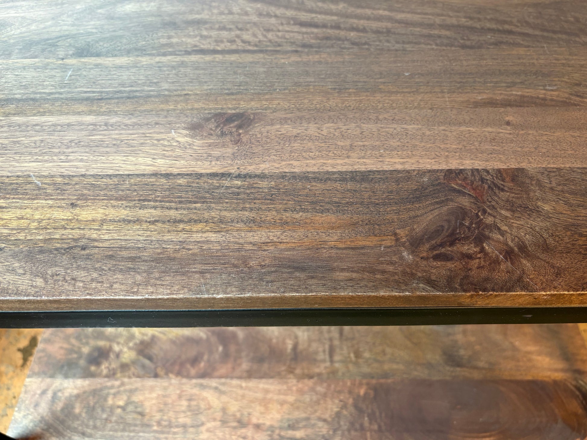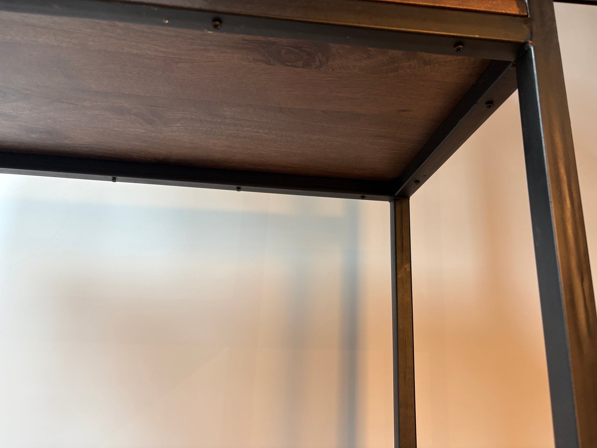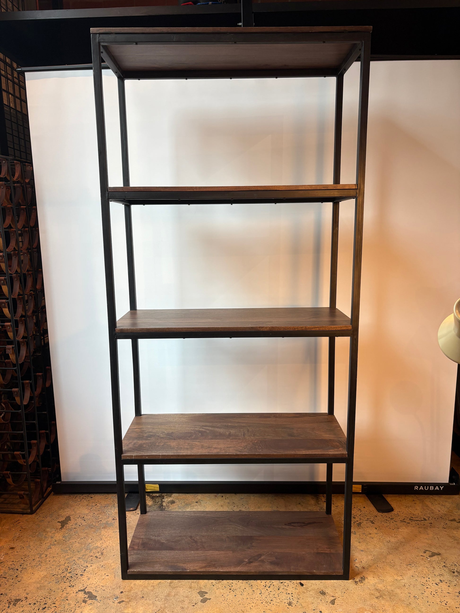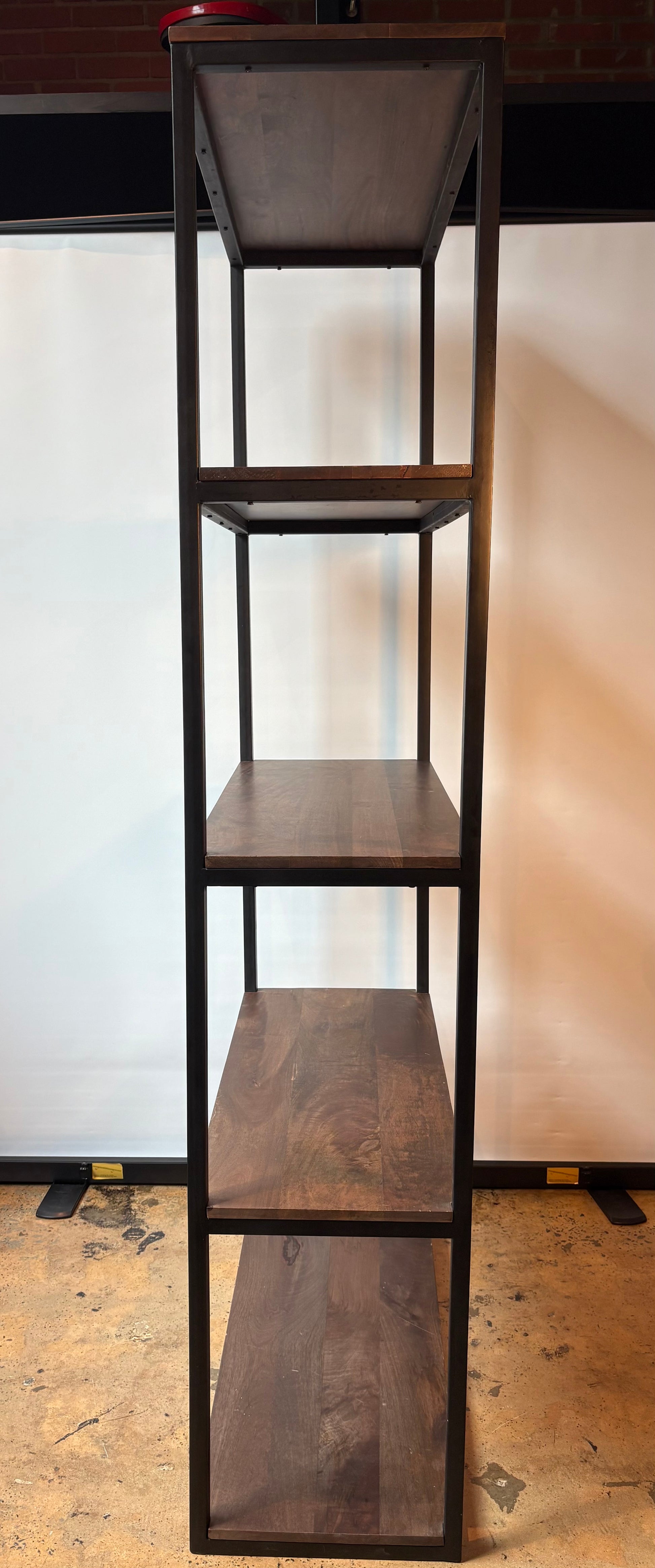 Large, Sturdy Wood & Metal 5-Tier Bookshelf in fair used condition with some small scuffs and scratches on the shelves.